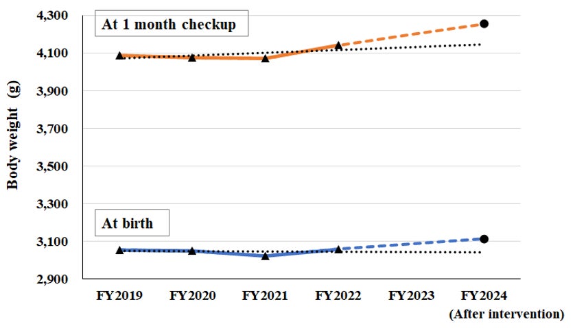 以下のグラフは出生時および1か月児健診時の体重を経時的に示し、回帰直線を引いたものです。1か月児健診時の体重の推移では2019年度から2022年度の平均体重と、本プロジェクトに参加した新生児の1か月児健診結果との間には有意な差が認められ、大きく右肩上がりを示しています。出生児の体重においても、2019年度から2022年度までは大きな違いが生じていませんが、本プロジェクト参加者では増加傾向がみられます(回帰直線を2024年度まで延長した時の予測体重に比べて、本プロジェクトによる介入後体重は上方にシフトしています)。