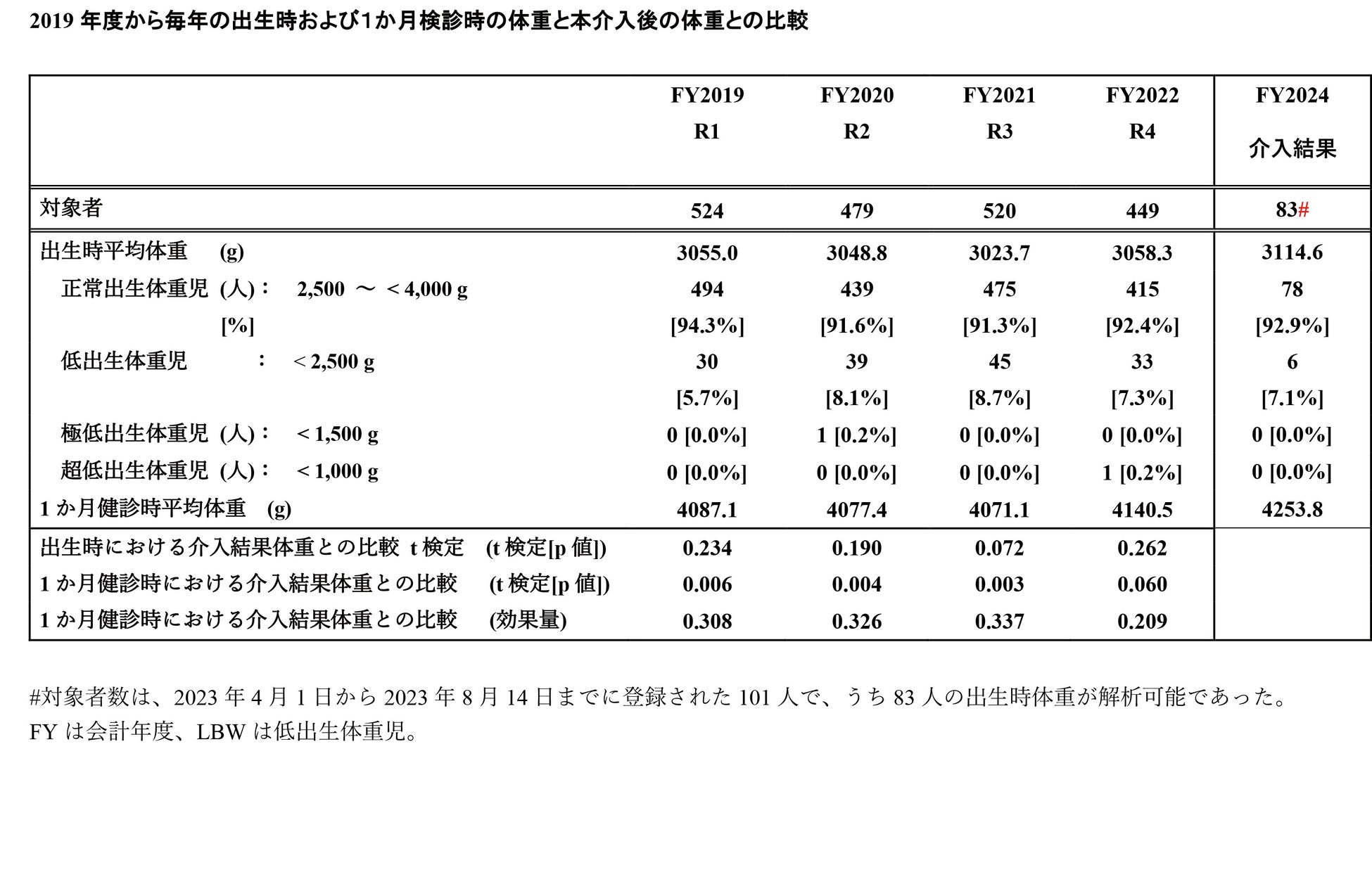 妊産婦への体調改善効果だけでなく、赤ちゃんの出生時体重増加には大きな意義があります。ここ20年、国内で新生児・乳幼児の体重は低下傾向にありました。世界中で、低出生体重児は医療的ケアが必要であることが多く、発育に遅延が生じたり、成人後も健康に関わるリスクが大きいことが指摘されています。そのような点から、本プロジェクトの調査結果は、出生児数が減少し、高齢出産率が増加傾向にある我が国の出産事情に鑑みても非常に重要であり、今後の支援策の基盤につながる可能性があります。