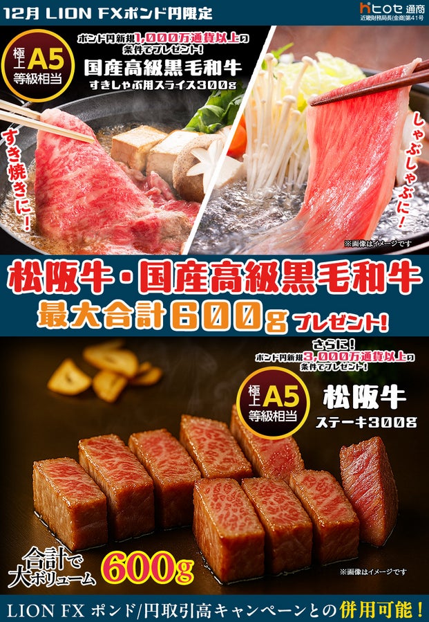ヒロセ通商株式会社 (本社:大阪府西区、代表取締役:野市 裕作、以下:当社)は、当社の提供する「LION FX」において、2025年12月1日(月)より、「LION FXポンド円限定 松阪牛・国産高級黒毛和牛最大600gプレゼントキャンペーン」を実施することをお知らせいたします。