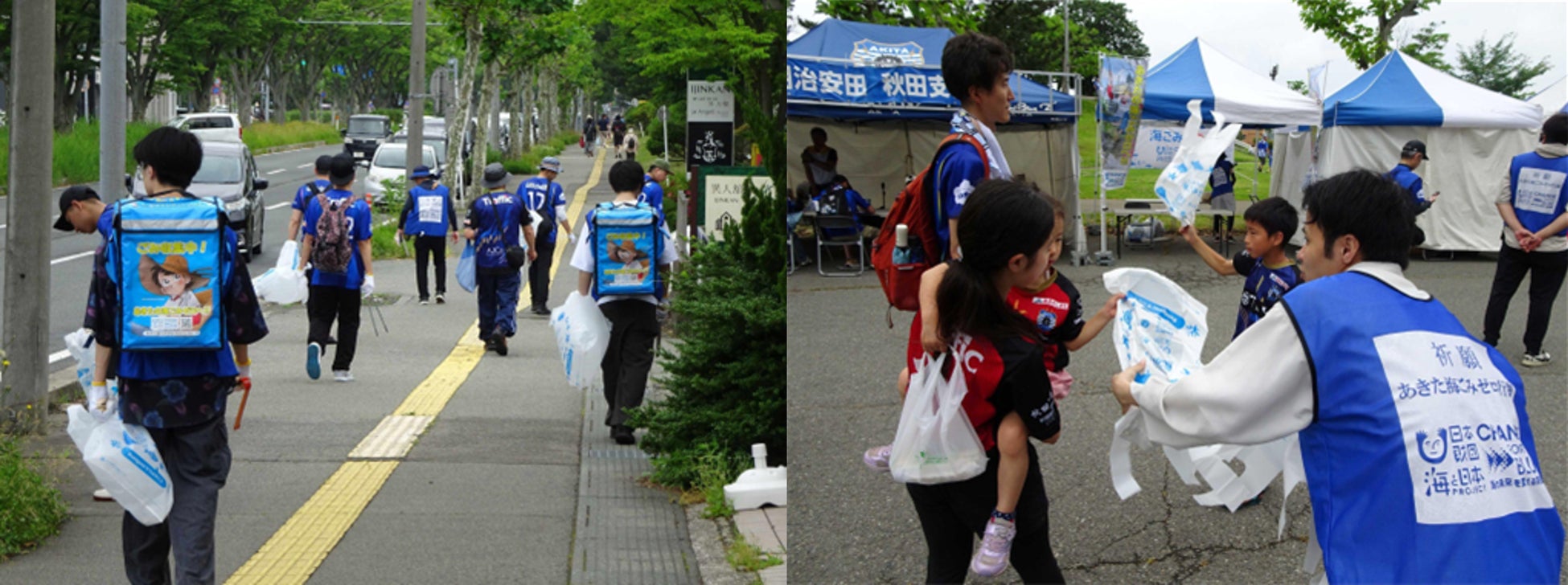 あきた海ごみゼロプロジェクト実行委員会は、6月22日(日)に秋田の海洋ごみゼロを目指す活動の一環として、ブラウブリッツ秋田(J2リーグ加盟)との連携プロジェクト「TRUE BLUEクリーンアップ」を、ブラウブリッツ秋田のホームゲームに合わせて行いました。サポーターとマッチスポンサーの東電化工業の皆さんとともに試合前にソユースタジアム周辺の歩道のごみを拾いました。このイベントは、日本財団が推進する海洋ごみ対策プロジェクト「海と日本プロジェクト・CHANGE FOR THE BLUE」の一環で開催するものです。