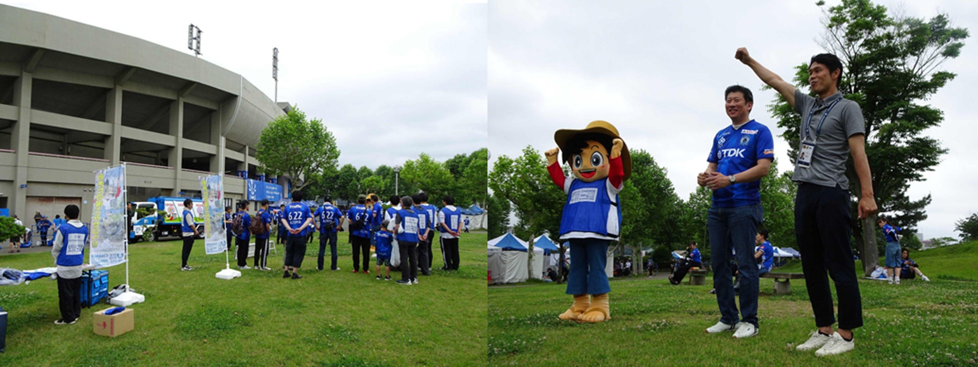 スタジアム周辺のごみはそれほど多くなかったものの、道路端にポイ捨てされたたばこの吸い殻や、雑草に埋もれていた飲料のペットボトルなどを拾いました。参加者は、スタジアムへの道を綺麗にして秋田と山形のサポーターを気持ちよく迎えたいと話していました。スタジアム前ではブラウブリッツ秋田のブラウゴン、あきた海ごみゼロプロジェクトのイメージキャラクターである釣りキチ三平くんがお出迎えし、参加者全員で記念撮影を行いました。