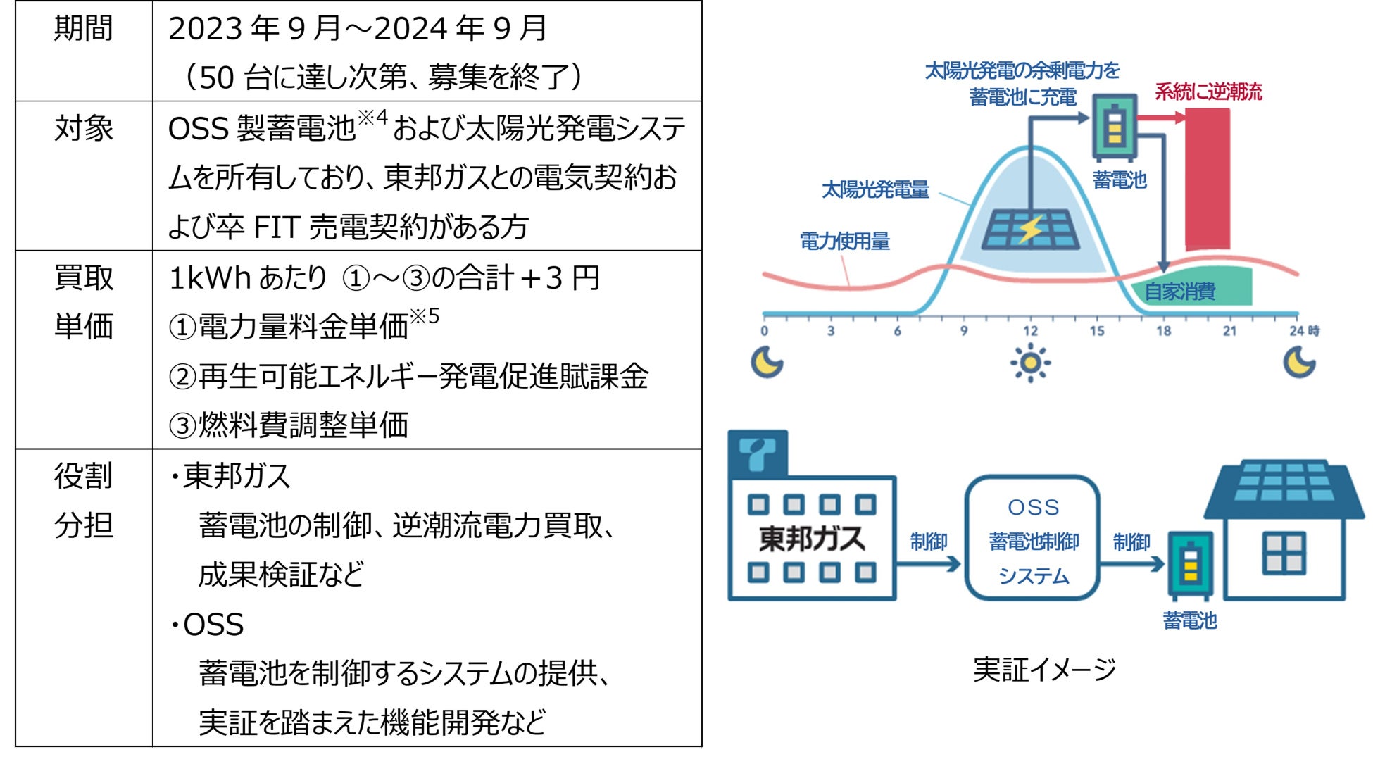 本サービスは、電力需給逼迫時などのタイミングで、東邦ガスがOSSの蓄電池遠隔制御サービス「POWER JUGGLING」※1を活用してお客さま先に設置された蓄電池を放電させ、この結果生じる逆潮流電力※2を買い取るものです。こうした家庭用蓄電池からの逆潮流電力を買い取るサービスは、国内初のものとなります。