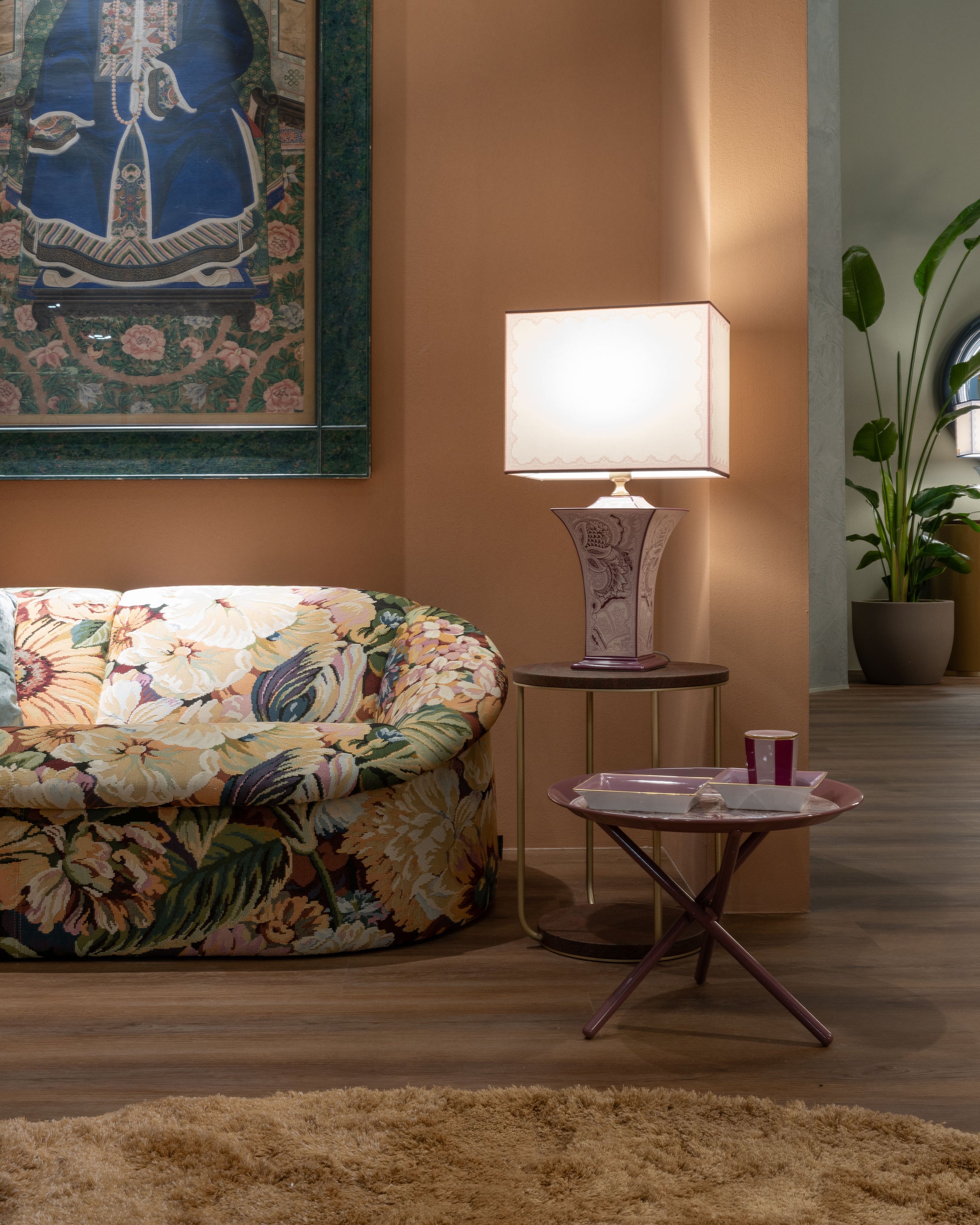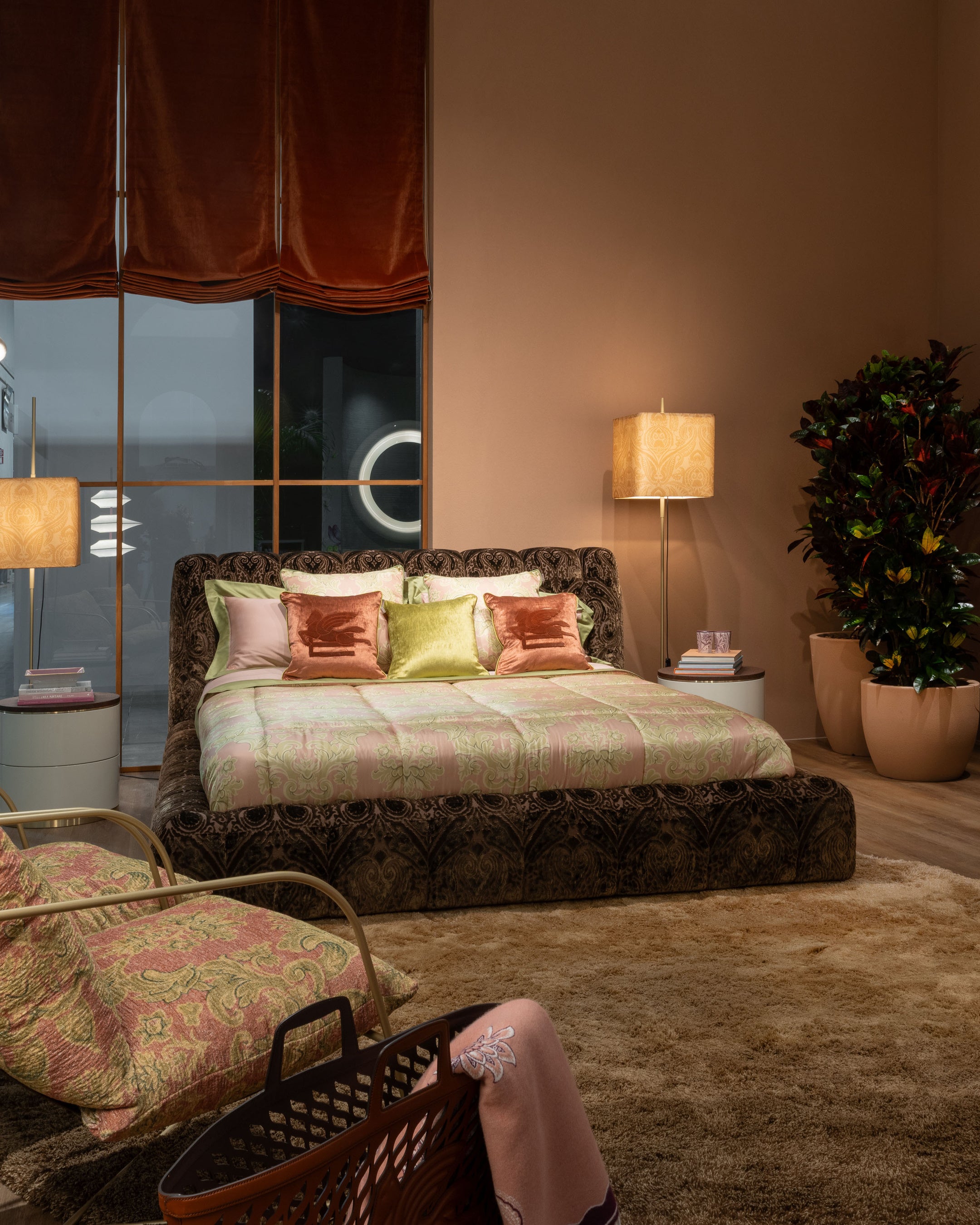 ミラノサローネ国際家具見本市での展示は、3つのリビングエリア、ダイニングルーム、ベッドルーム、ワークスペース、そしてリラクゼーションエリアに区分けされ、色とファブリックが織り成す調和によって、エトロのストーリーとライフスタイルのコンセプトを語ります。柔らかいグリーンとピンクに微かなくすみを加えた色合いから、木のぬくもりとゴールドの輝きを添えたベージュまで、落ち着いたニュートラルなパレットが一つ目のリビングエリアとワークスペースを包み込み、心地よく洗練された空間を作り出しています。