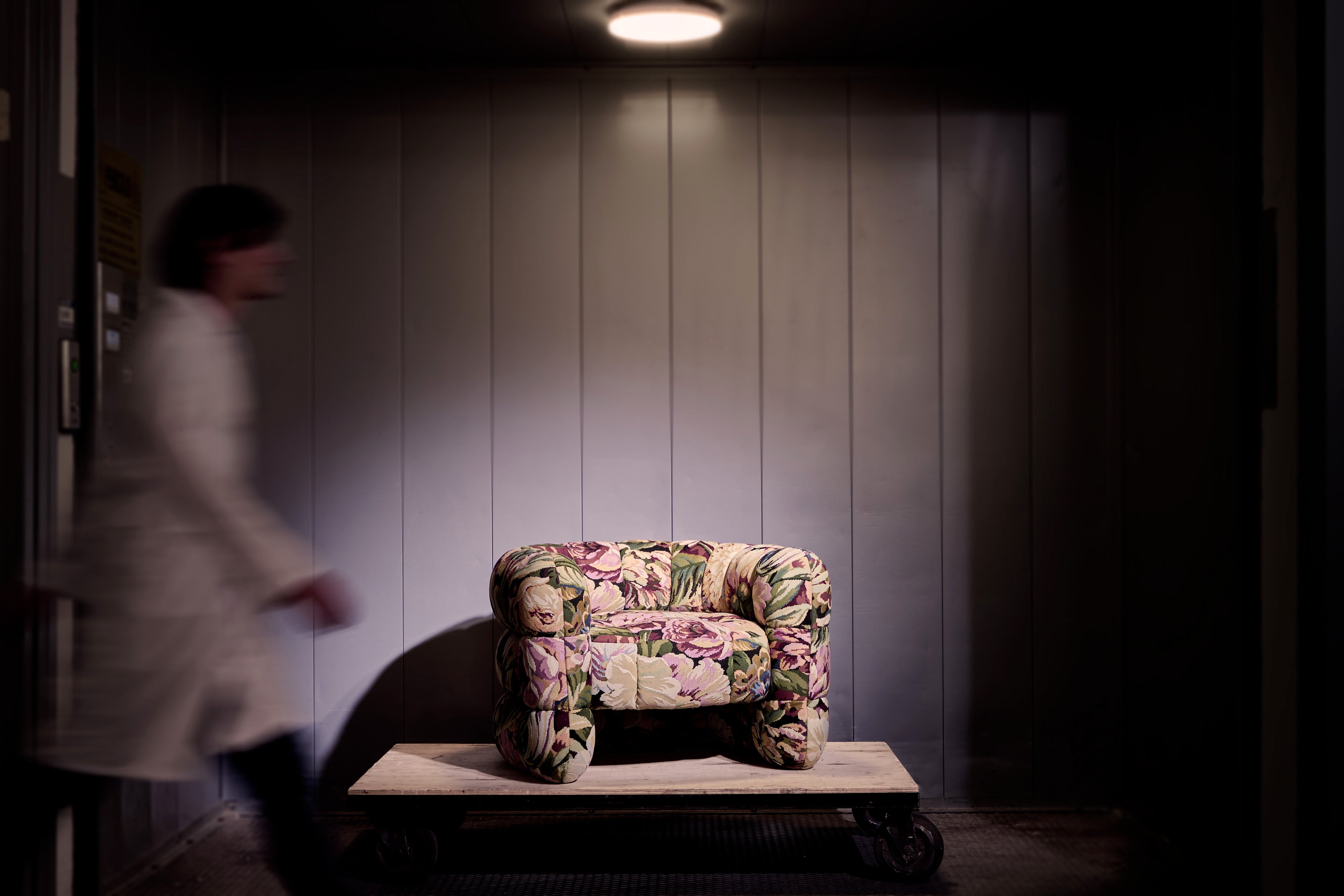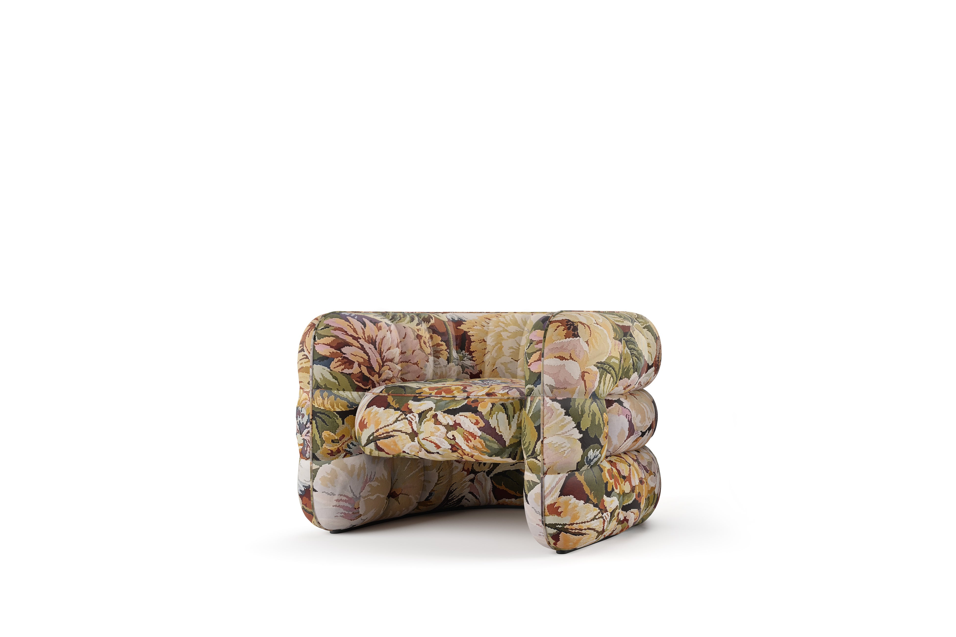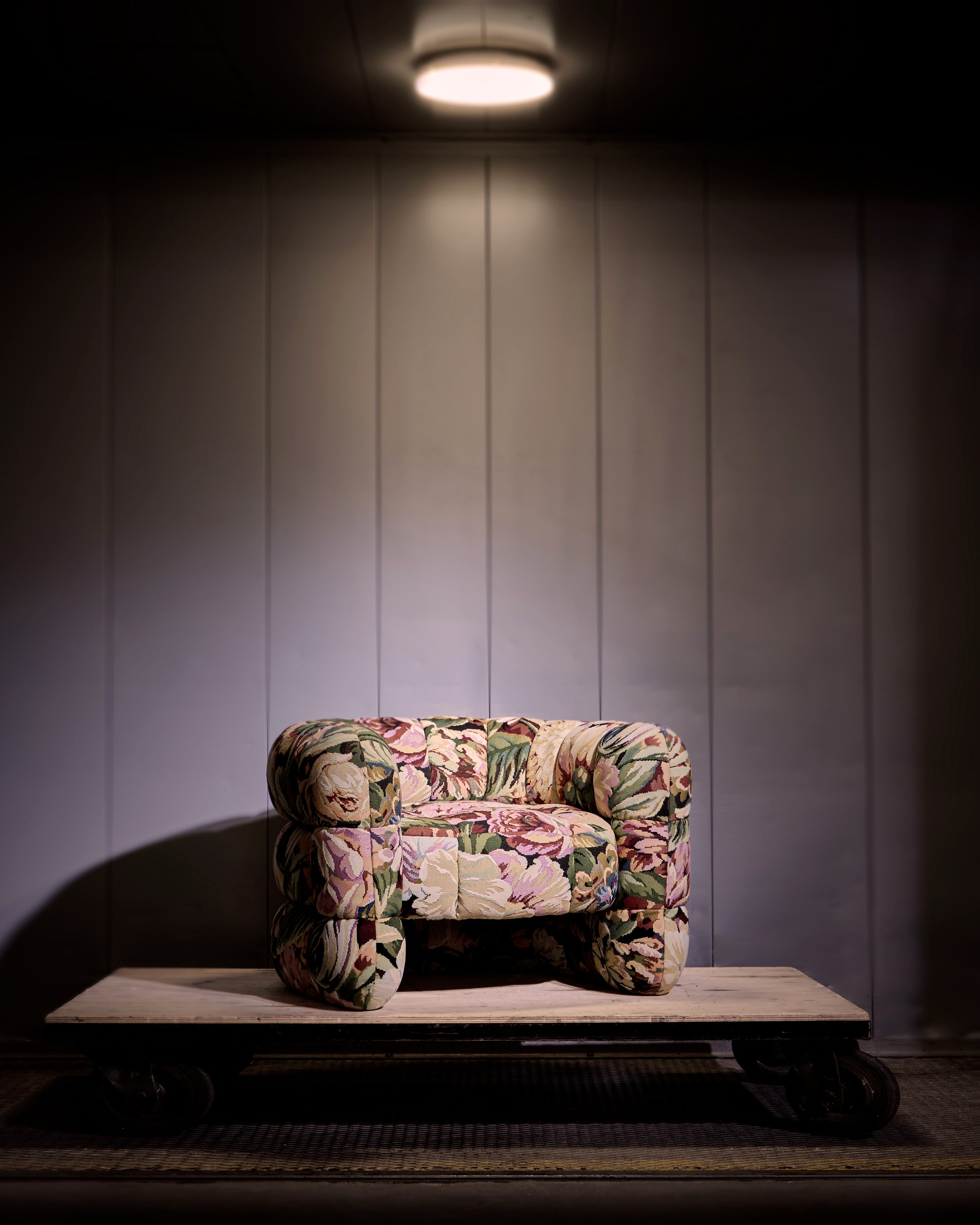展示スペースの中でも、ファッションショーに登場した贅沢なプリントや豊かな質感を誇るファブリックを施したアイテムは、ベーシックなシルエットとのコントラストにより、その存在が際立っています。その中でもアイコニックなのは、ソファ、アームチェア、ベッドなど、ソフトで包み込むようなフォルムとしなやかなラインが特徴の「キルターナ」コレクションです。キャピトネスタイルを彷彿とさせる四角いキルティングは、現代的なアレンジを加え洗練された佇まいを醸し出します。