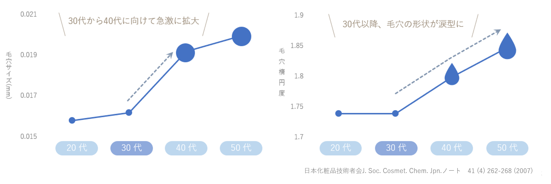 30代以降の毛穴悩みは、角栓詰まりによる小鼻周りの毛穴目立ちから、乾燥やたるみによる頬部の開いた毛穴目立ちへ変化していきます。実際に30代以降は、毛穴のサイズが大きくなり、その形が涙型に変化していくことが知られています。