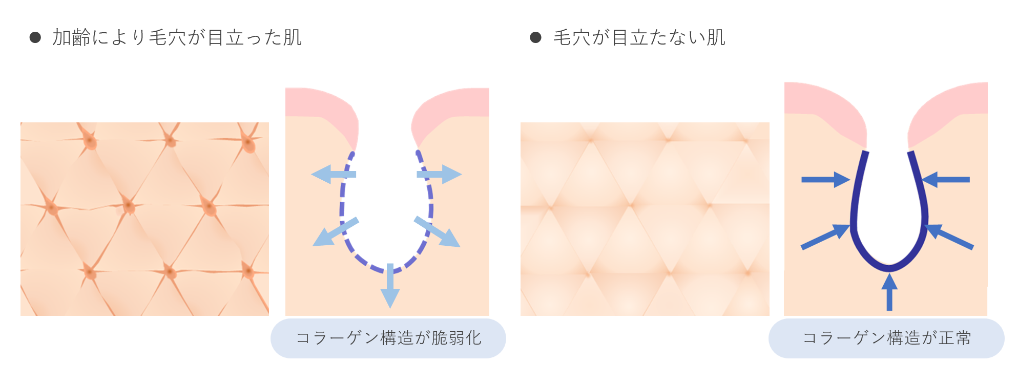 その原因として考えられるのが、乾燥によるキメの乱れと毛穴周りのコラーゲン構造の脆弱化です。乾燥によりキメの状態が乱れると、毛穴が目立ちやすくなります。また、毛穴の形状は毛穴周りのコラーゲン構造によって維持されているため、加齢とともにコラーゲンが減少すると、毛穴周りのコラーゲン構造が弱くなり、毛穴の形状を維持できなくなってしまいます。そのため、毛穴は涙型にたるんだ状態で開きやすくなり目立ってしまいます。たるんだ毛穴を改善するには、乾燥によって乱れたキメの改善だけでなく、毛穴周りのコラーゲン構造を強化することが有効です。