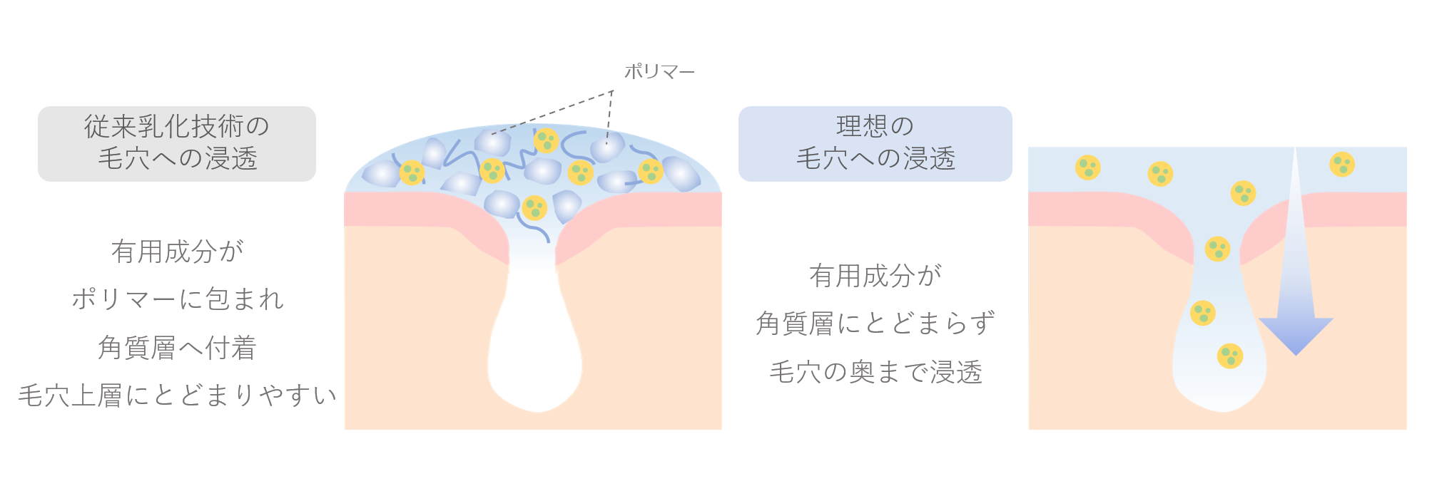 一方、界面活性剤や高分子ポリマーによって設計された従来の乳化技術では、有用成分を毛穴の奥まで届けることが難しいという問題がありました。これは、ポリマーが油溶性成分を包み込むことによって乳化状態を安定化させるという特性上、ポリマーが角質層上に網目をつくり、毛穴上層にとどまりやすい性質を持っているためです。
