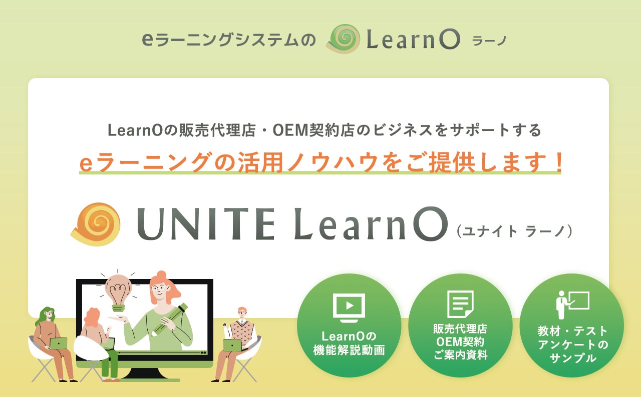 「UNITE LearnO(ユナイトラーノ)」は、LearnOの活用ノウハウをご提供する、特別なLearnOです。下記のような「LearnOを再販売する際に役立つノウハウ」を中心に、LearnOを最大限ご活用いただくためのコンテンツを多数公開する予定です※。