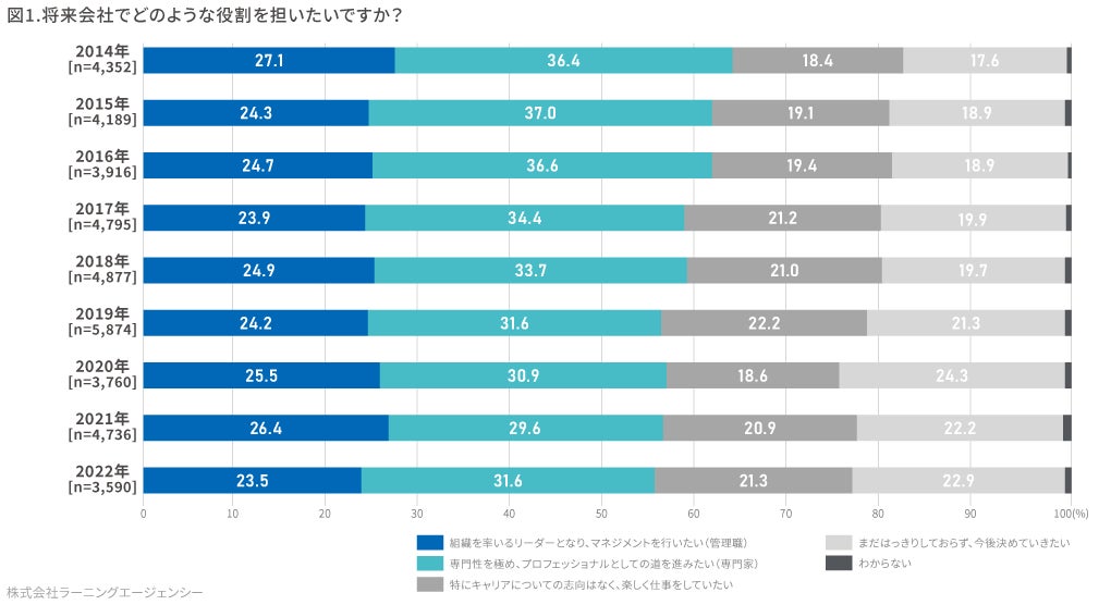 2022年の新入社員に将来会社で担いたい役割を尋ねたところ、「専門性を極め、プロフェッショナルとしての道を進みたい」が最多となる31.6%を占めました。第2位は「組織を率いるリーダーとなり、マネジメントを行いたい(23.5%)」となっています。ただ、こうしたリーダー志向、専門家志向は全体として年々減少する傾向が見られ、2022年の新入社員では過去最低値でした。反対に、「特にキャリアについての志向はなく、楽しく仕事をしていたい(21.3%)」「まだはっきりしておらず、今後決めていきたい(22.9%)」では2014年以降、増加傾向が見られます。こうした新入社員の時点でリーダー志向を持っていない、決めていないという人の割合は、2022年では過去最高の44.2%を占めました(図1)。