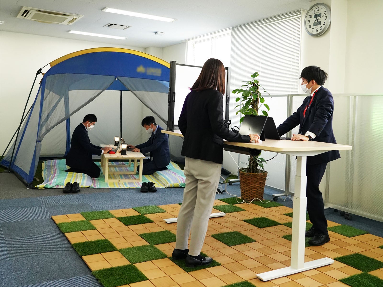 オフィス内を見渡すと、ひと際目を惹くキャンプ用のテントが置かれており、テント内にはプロジェクターと座卓が設置され、リラックスした気分で会議や日常のコミュニケーションを取ることができます。
