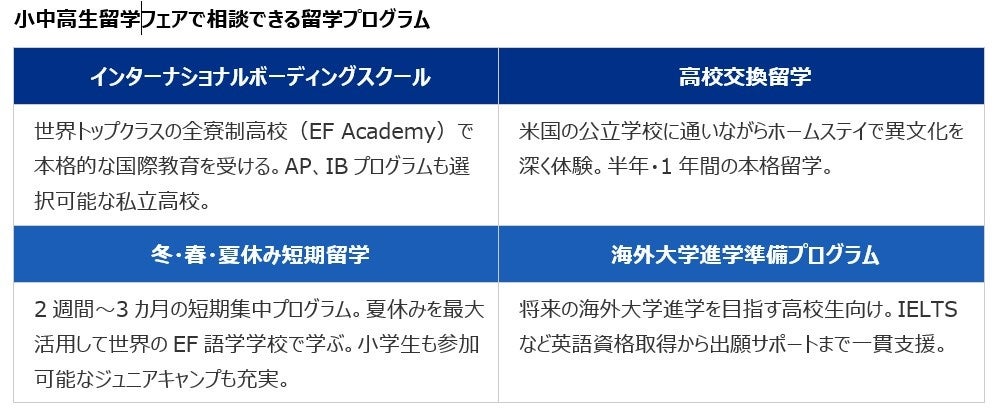 ■4つのプログラムを同時に比較・相談できる 引率付きグループ留学、短期留学から交換留学、ボーディングスクール、大学進学準備まで一度のフェアで比較検討が可能。お子さまの年齢・目的に合った最適なプランを専門カウンセラーが提案します。
