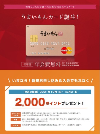 ■うまいもんカード新規入会キャンペーン内容 2021年10月1日(金)~2021年12月31日(金)申込 かつ、2022年1月31日(月)までに うまいもんカードを新規に発券された方にもれなく、うまいもんドットコムで使える2,000ポイントを進呈。ポイントは発券の翌月下旬頃を目安に付与予定。