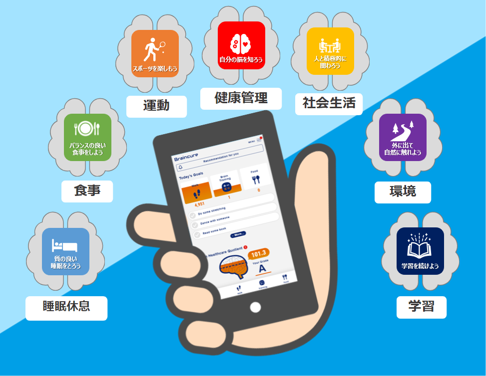『Braincure』は「楽しく無理なく脳を健康にするための18の行動指針」(BHQ Actions)を網羅した初のスマートフォンアプリです。BHQ Actionsに沿った日々のアクティビティー(健康管理、運動、社会生活、食事、睡眠休息、学習、環境)を入力することにより脳の健康状態を推定する推定BHQのスコアを算出することができます。さらに、BHQ Actionsに沿った脳を健康にするための情報を提供することにより、運動量の調整、食事改善、ストレス低減に向けたアクションを促し、アプリユーザーの脳の健康維持増進のサポートを予定しています。