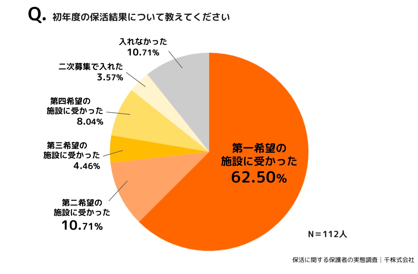 初年度の保活結果について質問したところ、「第一希望の施設に入れた(62.50%)」「第二希望の施設に入れた(10.71%)」「第三希望の施設に入れた(4.46%)」「第四希望以下の施設に入れた(8.04%)」「二次募集で入れた(3.57%)」「入れなかった(10.71%)」という結果になりました。