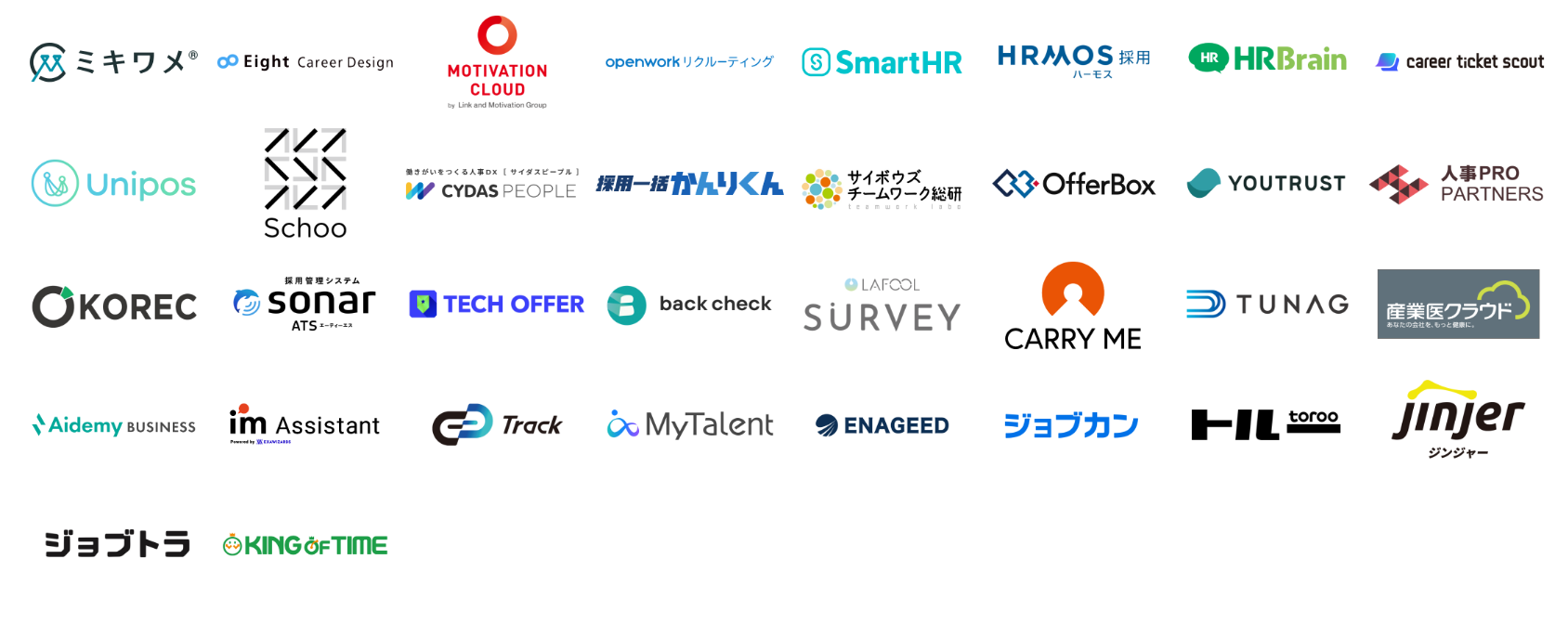 DONUTS、Hajimari、HRBrain、HRクラウド、i-plug、jinjer、Piece to Peace、ROXX、Sansan、Schoo、SmartHR、TalentX、Thinkings、Unipos、YOUTRUST、アイデミー、エナジード、オープンワーク、ギブリー、サイダス、サイボウズ、スタジアム、スタメン、ダトラ、テックオーシャン、ビーウェルインターナショナル、ビズリーチ、メンタルヘルステクノロジーズ、ラフール、リアライブ、リーディングマーク、リンクアンドモチベーション、レバレジーズ