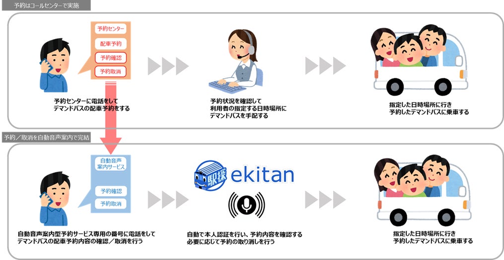 デマンドバスの予約機能を有した自動音声予約用UIも提供します。こちらはコールセンター業務の逼迫や運営コスト低減を目的としています。