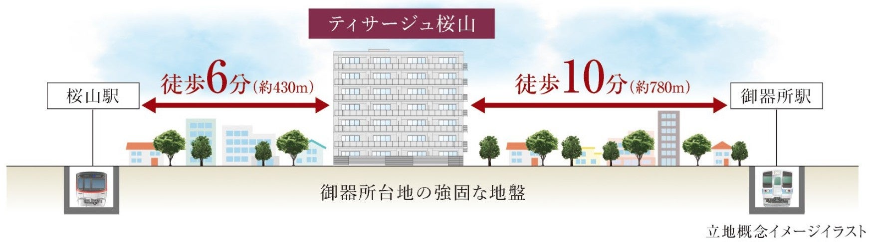 「ティサージュ桜山」は、都心への優れたアクセスと、穏やかな住環境を両立した7階建全28邸のレジデンスです。角地を活かした開放感ある設計で、住まう方の多様なライフスタイルに寄り添う、快適な住まいを実現しました。