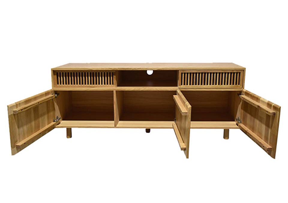 天板、収納部にはウォールナット天然木突板を使用しています。ウォールナット天然木の美しい木目を愉しめます。上段の格子状の引き戸と下段の扉はオーク天然木無垢材を使用しており、色の濃淡や質感など木材ならではの質感が楽しめます。
