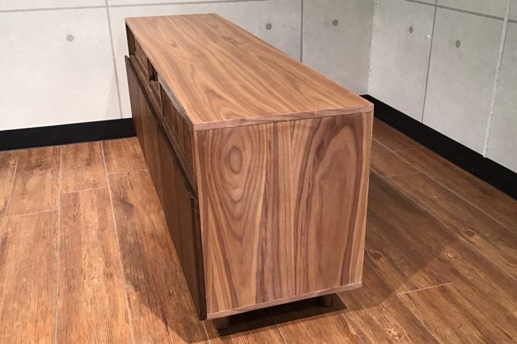 ミニマリズムを意識した新作キャビネットです。デザイン・機能美が兼ね備えられており、TV台としての役割もあり、収納はお部屋にこれ一台のみ、という使い方もできます。