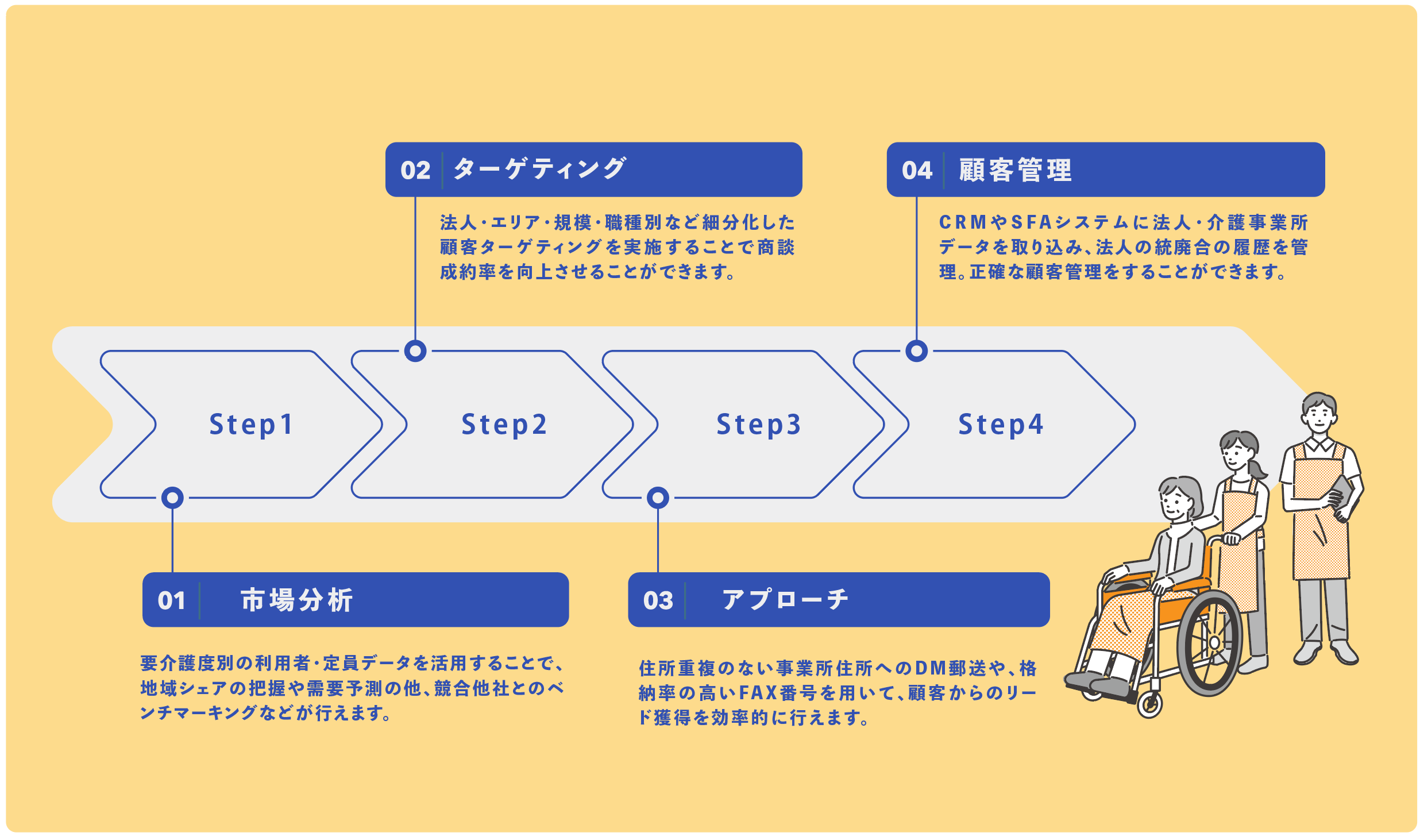 介護サービスを集約した「事業所」にDMを送付することや、格納率の高いFAX番号を用いて認知度向上のための施策を実施することができます。