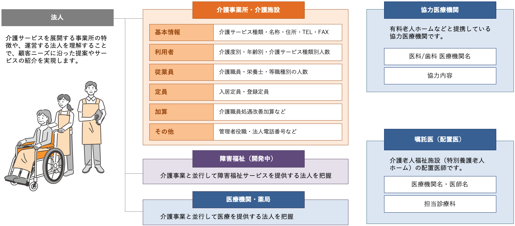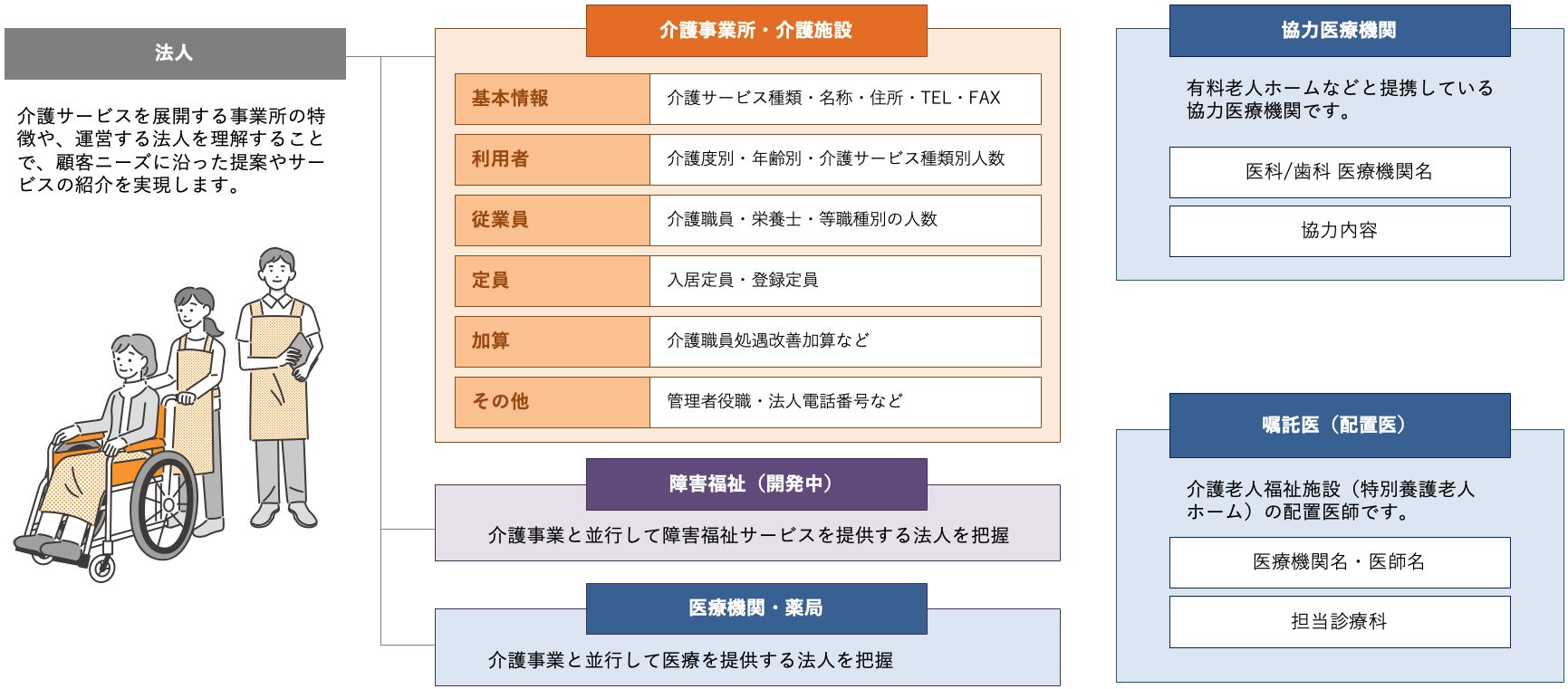 法人番号を99%付与した介護データベースで、法人の規模や戦略を正確につかむ。