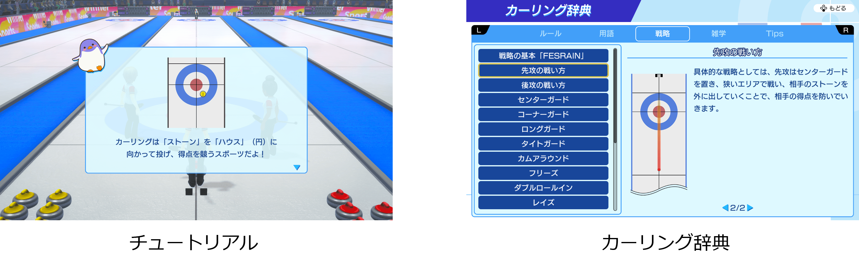 本作では、カーリングの操作や基本ルールを覚えられるチュートリアルや、ゲーム中にルールや戦略を確認できる(公社)日本カーリング協会監修のカーリング辞典も収録しており、カーリングのルールを知らない方でも安心して遊べるように設計されています。