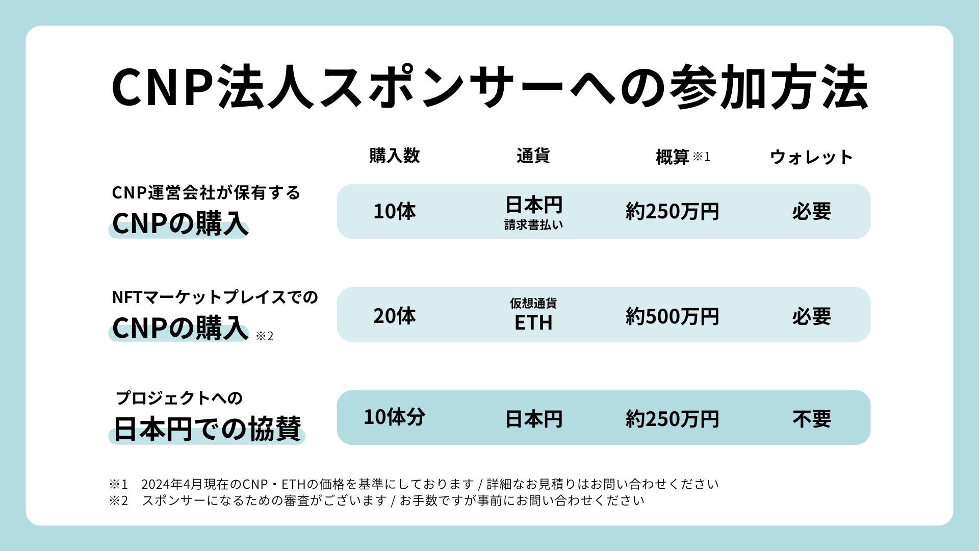これまでイーサリアムチェーンのNFT「CNP」を購入することが法人スポンサー参加の条件となっていましたが、仮想通貨を取り扱えない/NFTを保有するためのウォレットの管理ができないという企業様のニーズに対応するため、このたび新たに「日本円での協賛」という形式を導入。