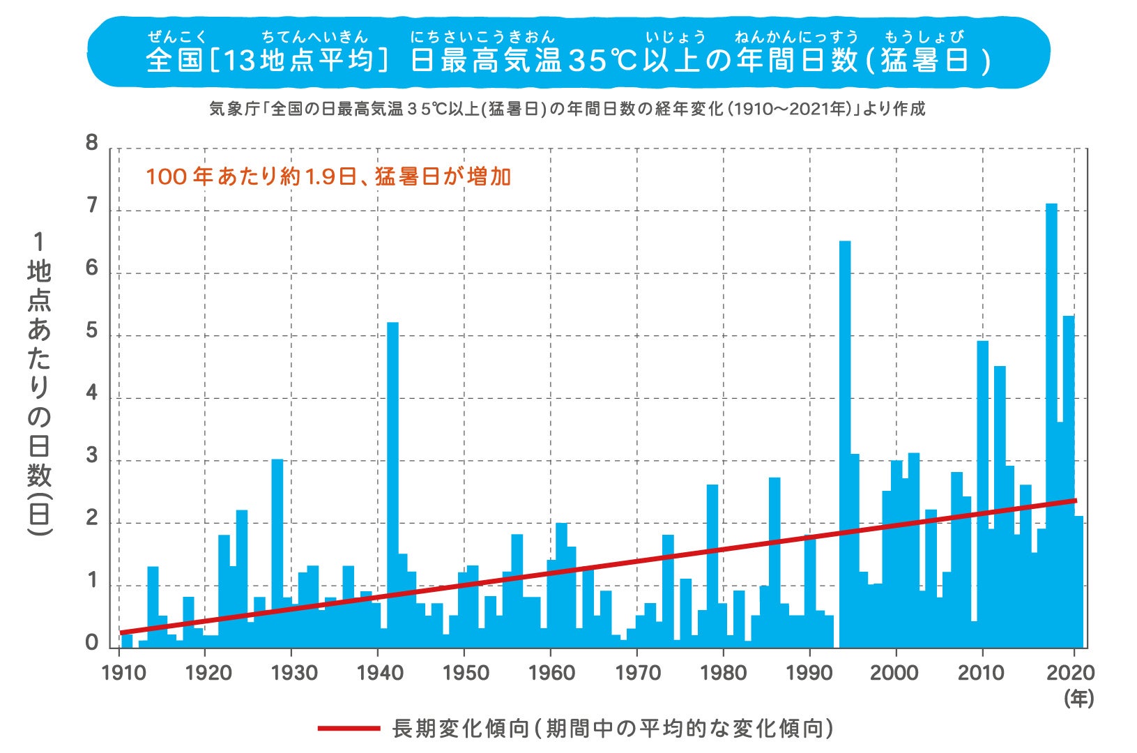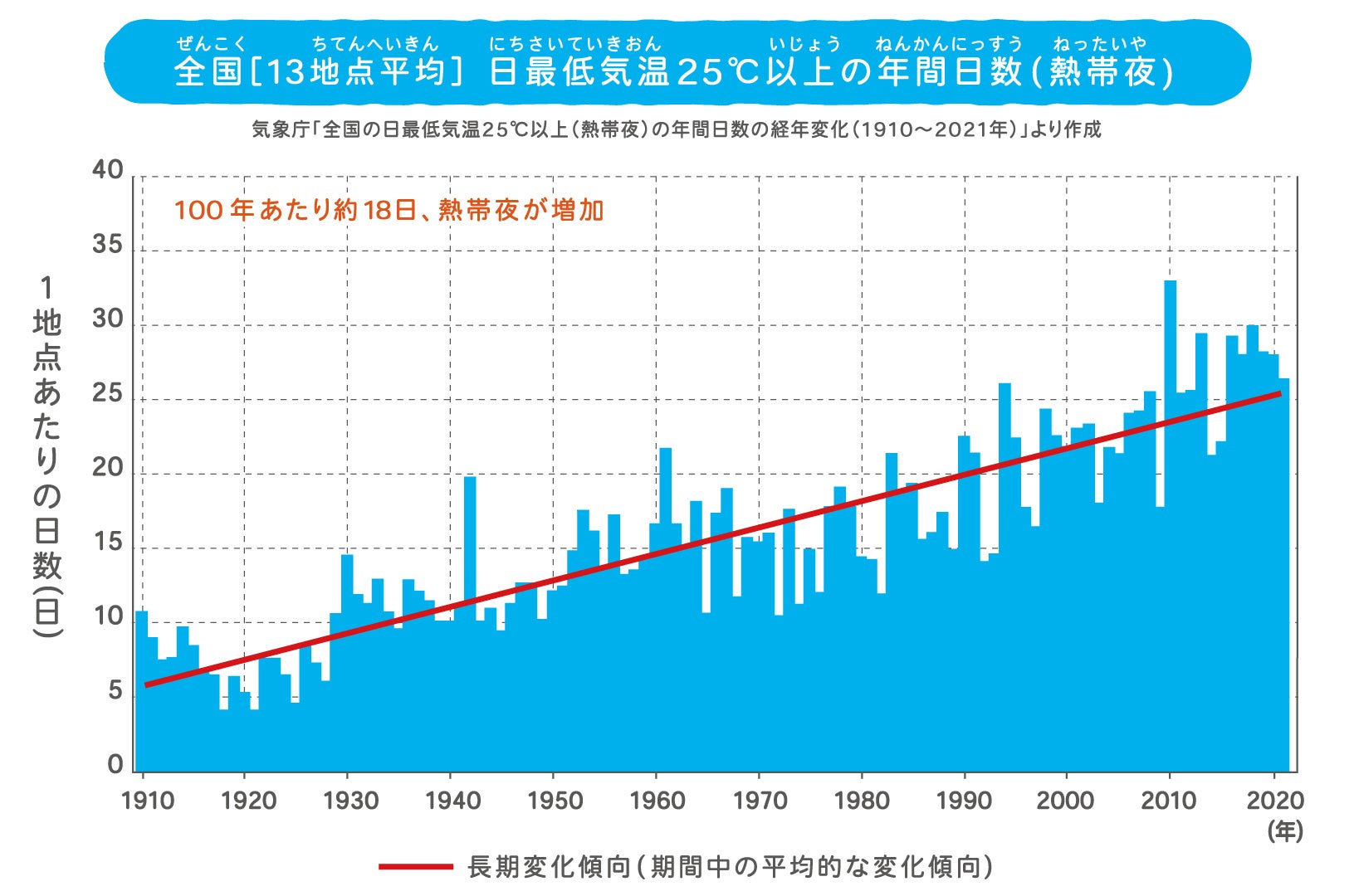全国の猛暑日(日最高気温35℃以上)の年間日数、熱帯夜(日最低気温25℃以上)の年間日数も増加しており、直近30年間(1992~2021年)の平均年間日数は、統計期間の最初の30年間(1910~1939年)と比べて猛暑日で約3.3倍、熱帯夜で約2.7倍に増加しています。
