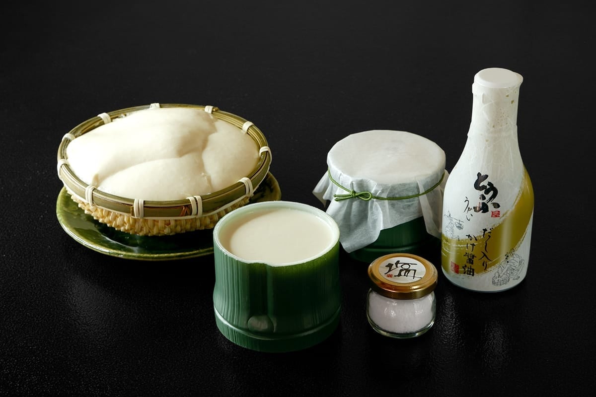 お土産処商品で人気の「くみあげとうふ(小盛)」「吟醸とうふ」に、「吟醸とうふ」と相性抜群の「さかたの塩」・うかいのとうふに合わせて作られた「だし入りかけ醤油」のセットです。