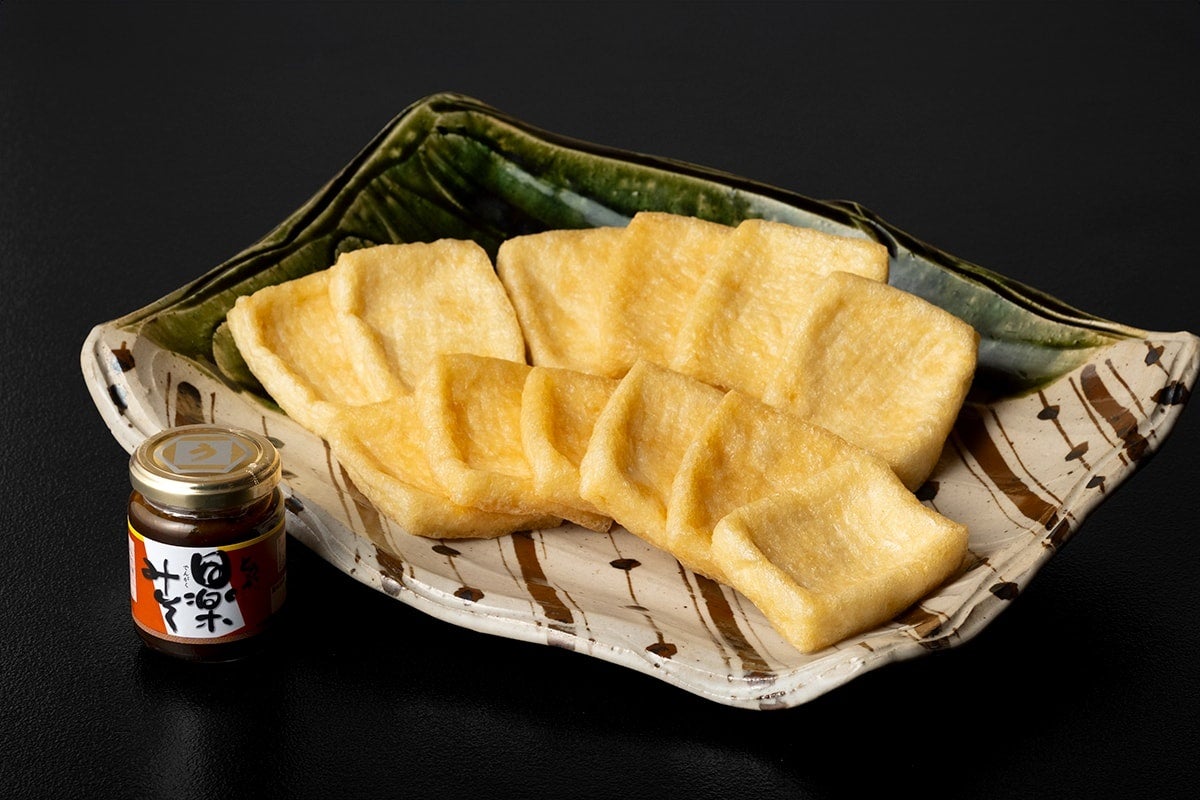 とうふ屋うかいでもコース料理内で提供される「あげ田楽」をご自宅でお楽しみいただけます。 油揚げ12枚に田楽みそ1個をセットでご用意しました。