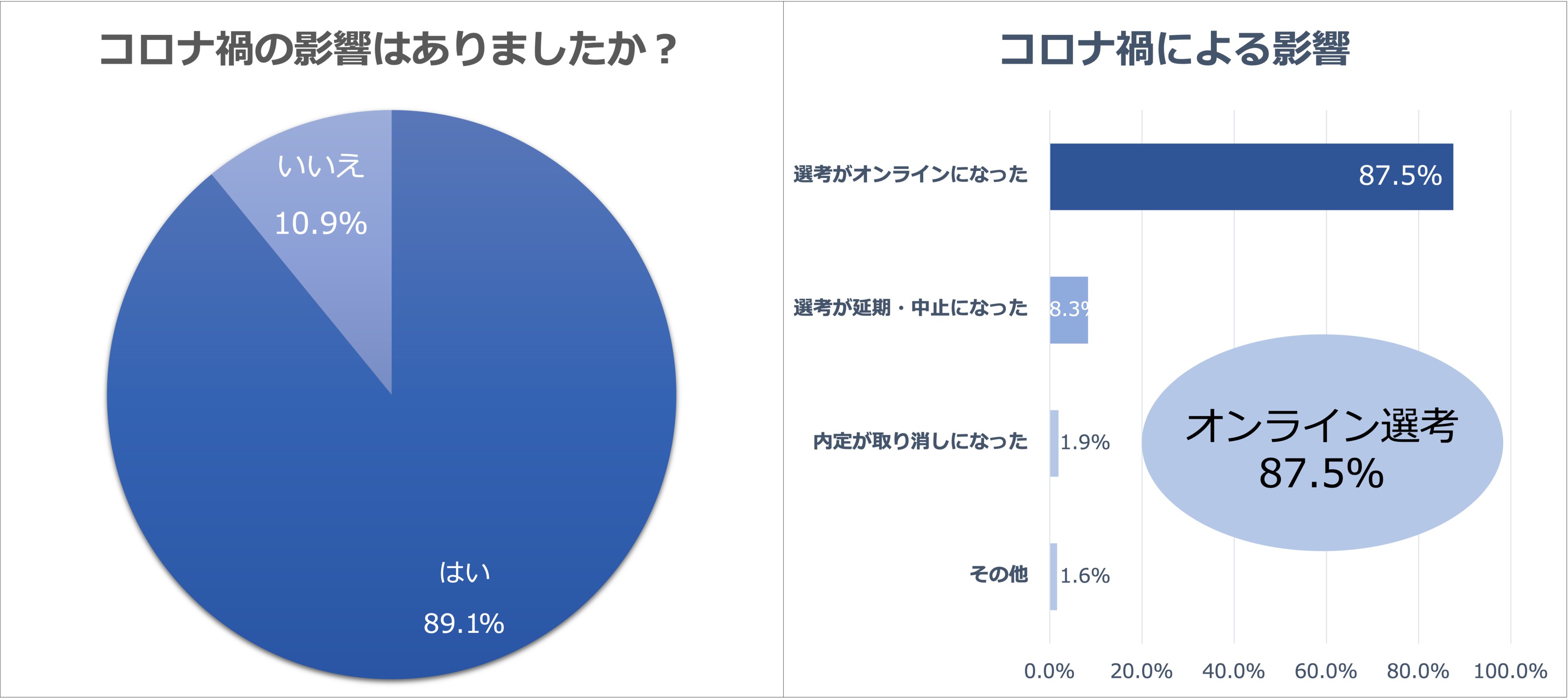 22年卒の就職活動におけるコロナ禍の影響については、全体の89.1%が「影響があった」と回答し。「影響はなかった」は10.9%という回答になりました。影響した内容については「選考がオンラインになった」が87.5%と最多回答で、「選考が延期・中止になった」が8.3%、「内定が取り消しになった」が1.9%の回答結果になりました。