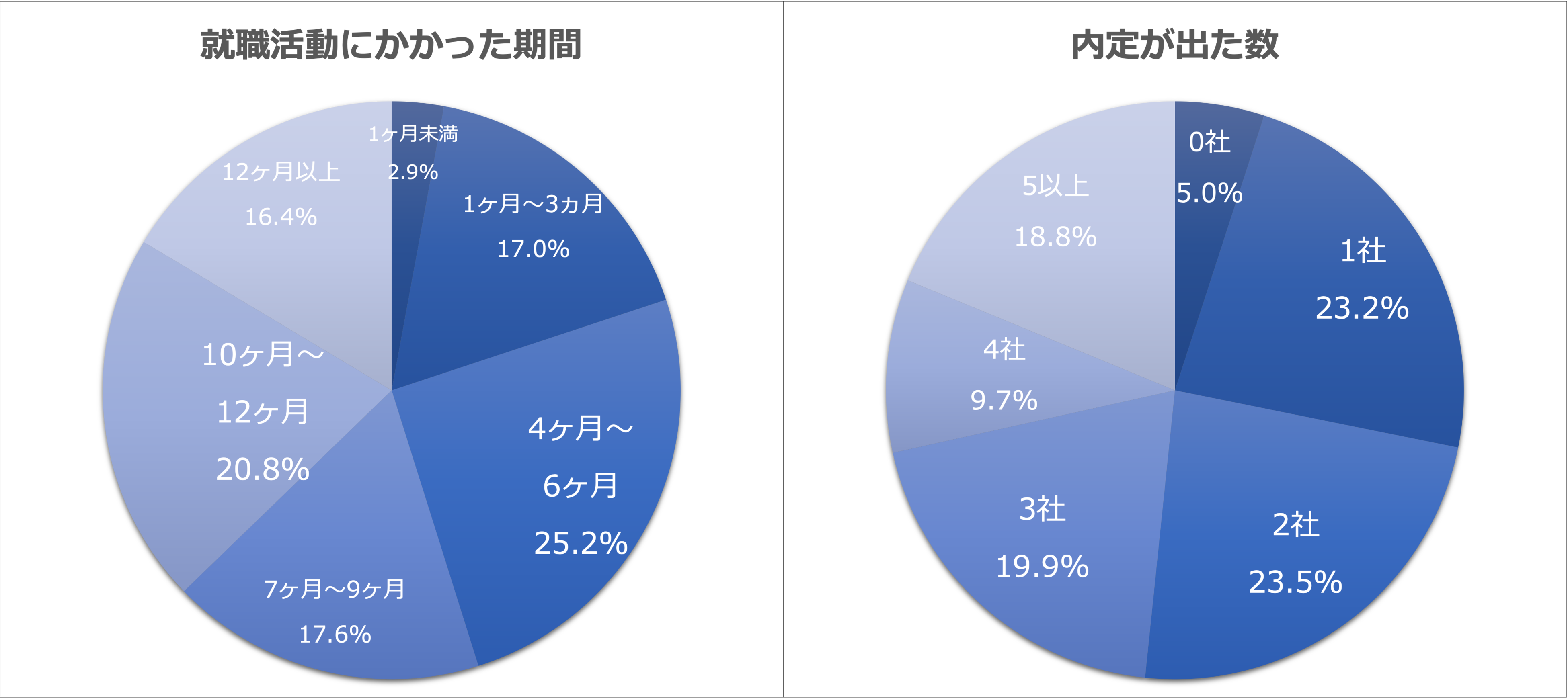 内定が出た社数については、「1社」が23.2%、「2社」が23.5%、「3社」が19.9%、「4社」が9.7%、「5社以上」が18.8%になり、全体で「3社以内の内定」が71.6%という回答結果になりました。