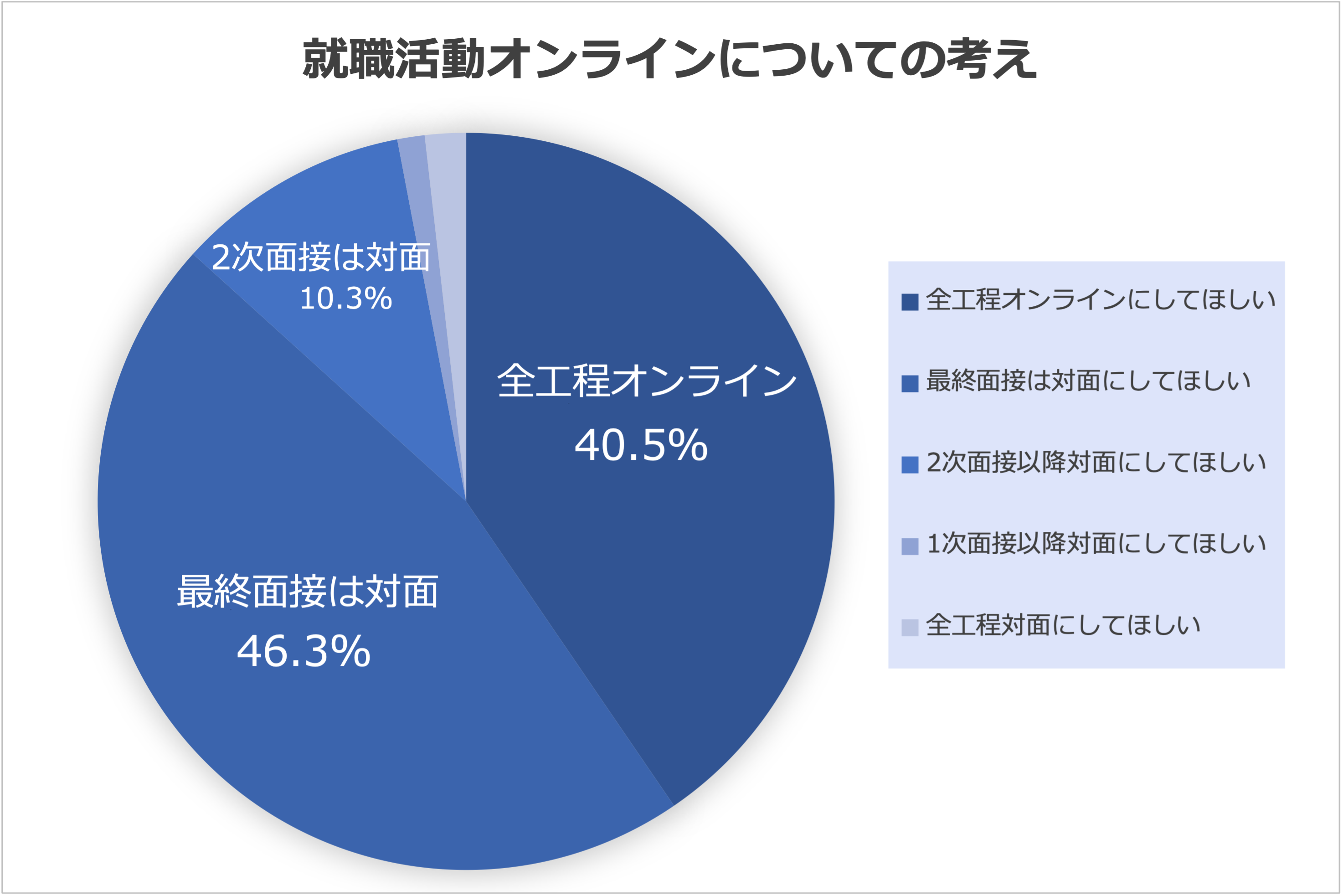 就活のオンライン化に対する考えについては、「全工程オンラインにしてほしい」が40.5%に対し、「最終面接は対面にしてほしい」が46.3%、「2次面接以降は対面にしてほしい」が10.3%、「1次面接以降は対面にしてほしい」が1.2%になり、選考の工程で対面を入れたハイブリッド型を希望する回答が全体の57.8%の結果になりました。また「全工程で対面にしてほしい」は1.8%と最も少ない回答になりました。