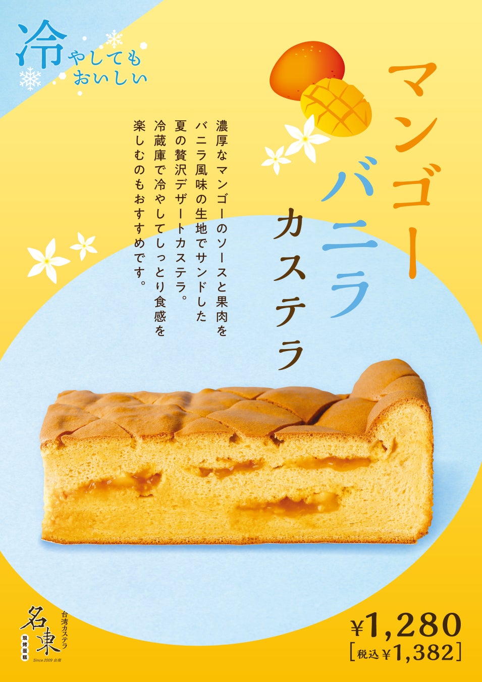 名東ならではの“シュワシュワ食感”カステラの生地に、旬のマンゴーを使用した爽やかな新商品。 8/3(土)より販売開始。東京都内4店舗にて夏季限定でご提供いたします。