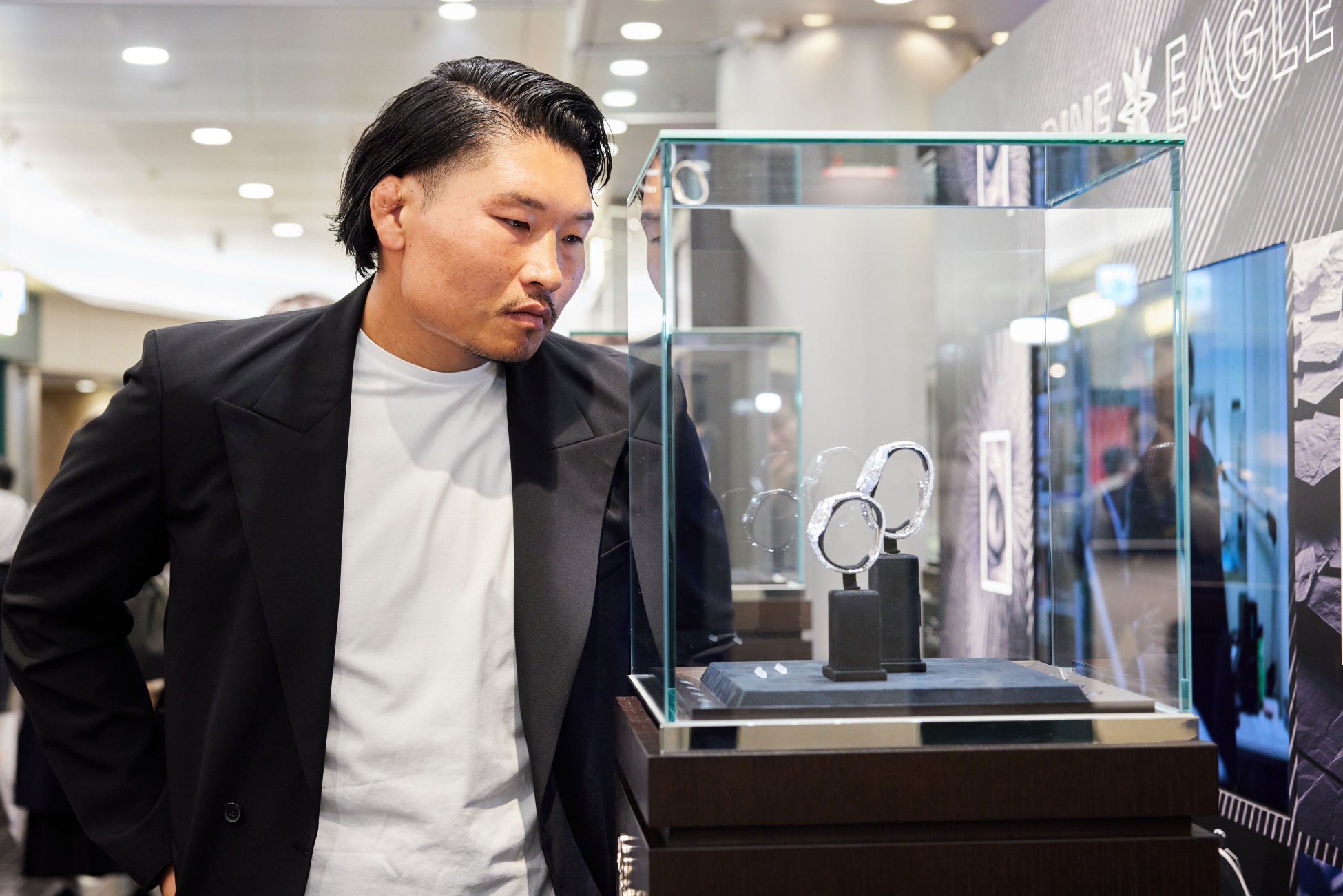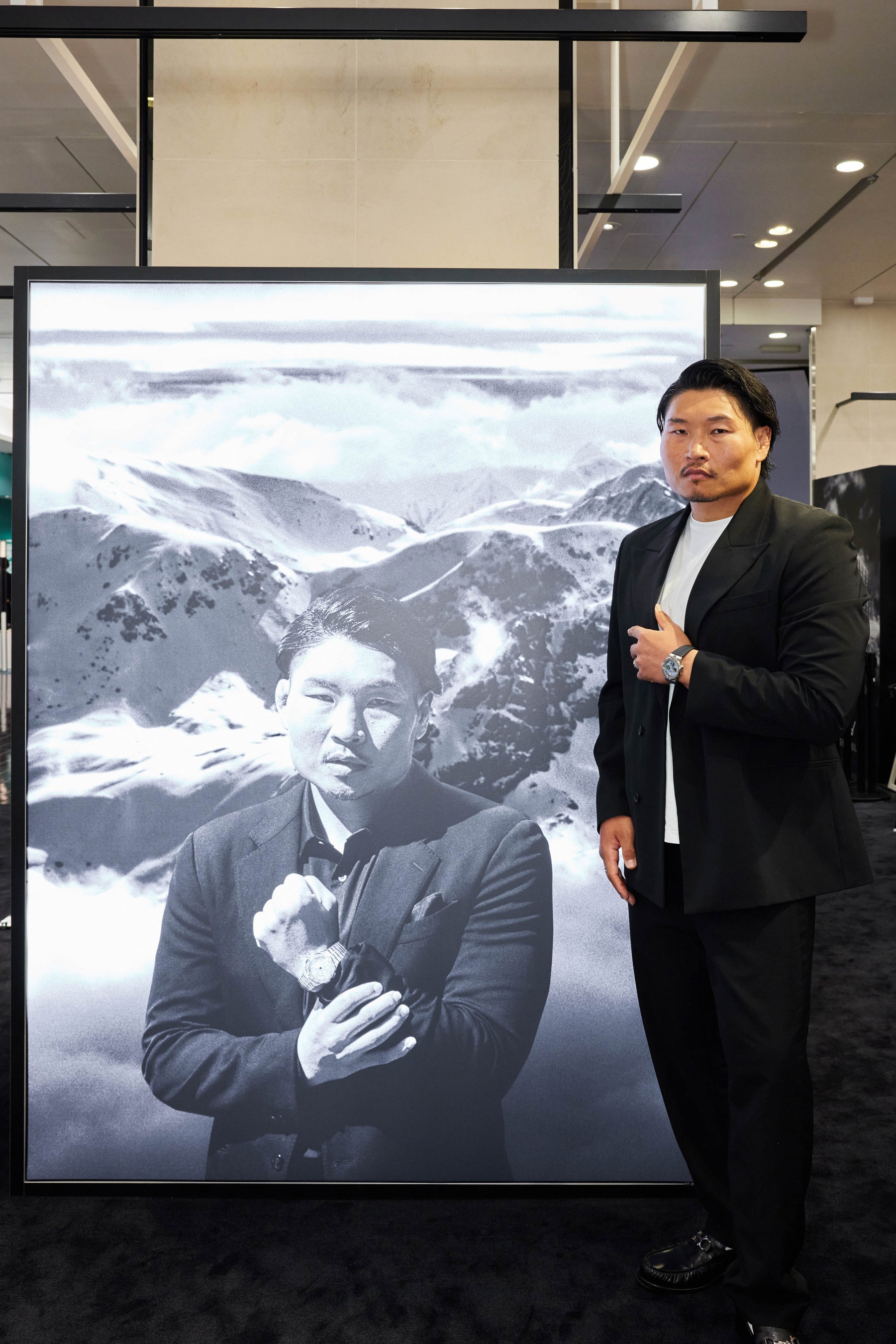 イベントには「アルパイン イーグル XL クロノ」の新作でローヌブルー文字盤を配したモデルと「アイスキューブ」リングを着用して登場した稲垣啓太さん。カール-フリードリッヒ・ショイフレとの久しぶりの対面に笑顔を見せ、リラックスした様子でトークショーに臨みました。次世代のラグジュアリースポーツウォッチをテーマに、コレクションの魅力やウォッチメイキングとラグビーの関連性などが語られました。「オシャレ番長」と呼ばれファッションリーダーとしても知られる稲垣啓太さんは、着用アイテムについて「僕は最初この文字盤の色に魅かれました。そしてお話を伺ってみると、スイスを流れるローヌ川をイメージして名付けられた「ローヌブルー」であることを知りました。この時計が生まれた場所を思い出させる文字盤に、僕は一目見た瞬間に引き込まれ、そして一目惚れしました。」とコメントしました。会場に大きく掲出された新ビジュアルについて聞かれると、「アルプスの一番険しい部分をイメージし、力強さを表現することを僕の中で一番のテーマにしました。そのために血管をどれだけ浮き上がらせるかということにフォーカスしたのですが、これは体を鍛えていてよかったと思えた瞬間でした。僕は手を握れば血管が浮き上がりますし、それを何回も繰り返せば腕まで血管が浮き上がってきます。少しながら、力強さを表現できたんじゃないかなと思います。」と、撮影を振り返りました。また、今年6月にスイスのショパール本社と工房を訪れた稲垣啓太さんは、時計作りの工程とラグビーのチームプレーについて「非常に似てるのではないかと思うところがたくさんあります。時計工房ではたくさんの職人が働き、時計製造の様々な工程を担い、一人ひとりにそれぞれの役割があります。ラグビーにおいても同じで、一人ひとりが役割を果たさないと、チームとしての歯車がまわらなくなってしまう。僕はその考えが、時計作りに通じているところがあると思います。」と時計製造とラグビーを重ねて語りました。
