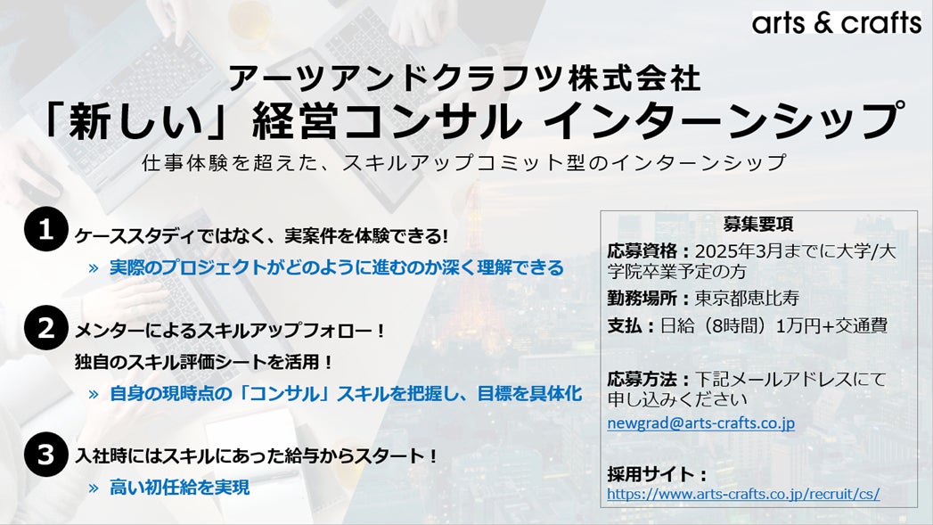 経営コンサルタント事業を行っているアーツアンドクラフツ株式会社はこの度、大学生向けに「新しい」タイプのインターンシッププログラムを開発しました。通常のインターンシップでは、学生はケース問題等に取り組みながら仕事を疑似体験することで社風や仕事のやり方の雰囲気を掴むのが目的となっています。それに対し、アーツアンドクラフツのインターンシップでは、その期間を通じて参加学生が社会人もしくは将来のコンサルタントとしてより成長・スキルアップできることを目指します。このインターンシップを通じで学生様が経営コンサルティングの仕事に興味を持ち、かつご自身のポテンシャルがどのくらいあるか、また社会人になって経営コンサルタントでの成長を目指す上で、どのようなスキルを上げていく必要があるのか可視化できる経験を提供します。
