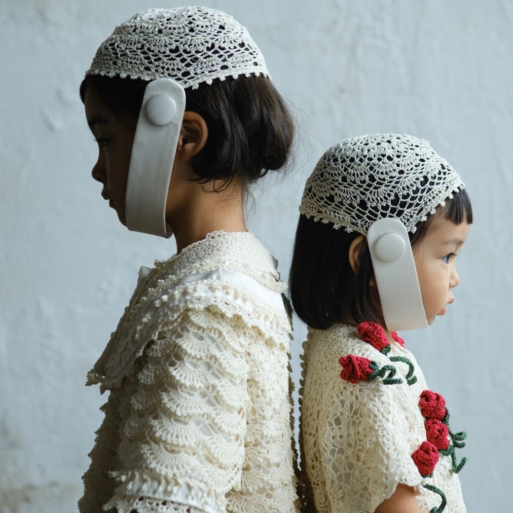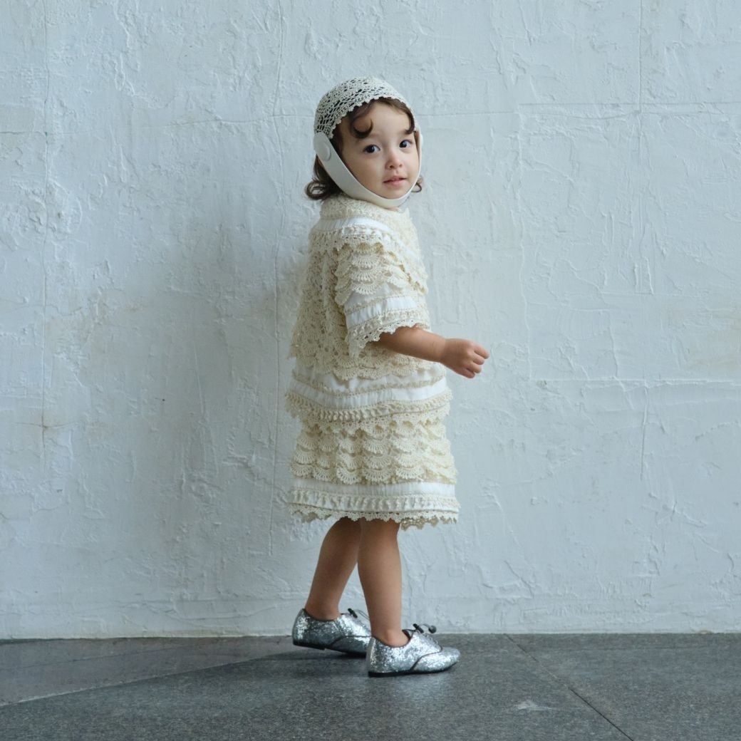 レース部分はドレスと同じ希少な綿糸を使用し、熟練した職人によるハンドニッティングで製作。