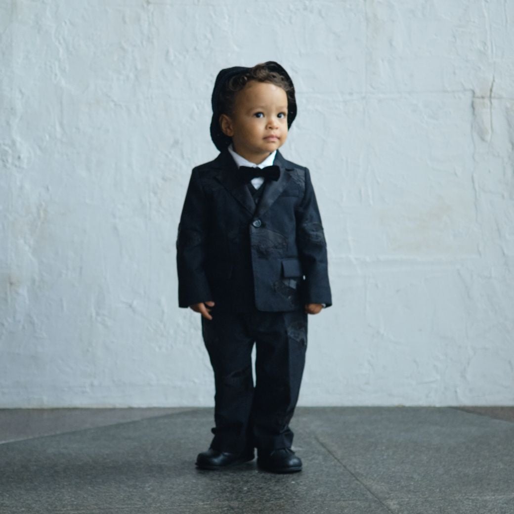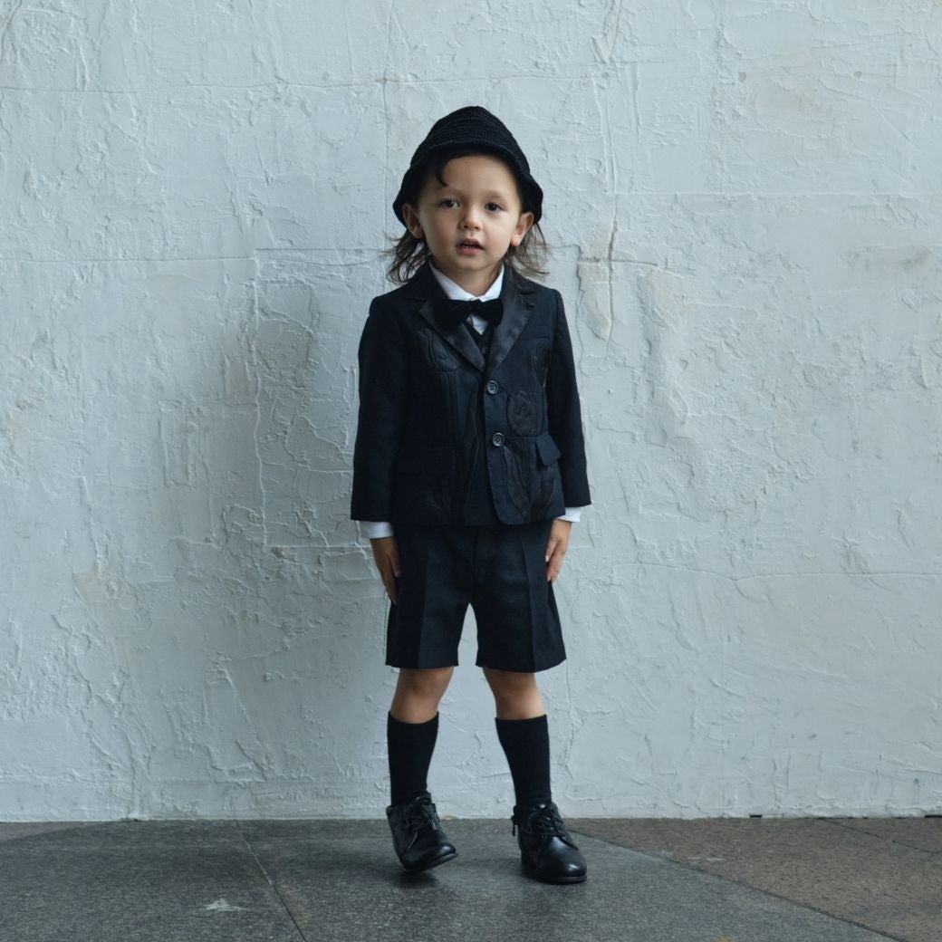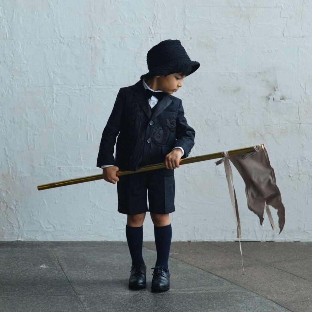 すべてのパーツをひとつひとつ手作業で作り上げた本格的なオートクチュールは、まるでアートピースのような精緻な作り。ハーフ丈のショーツで動きやすさも加味しました。 3ピーススーツとシャツの4点セット。