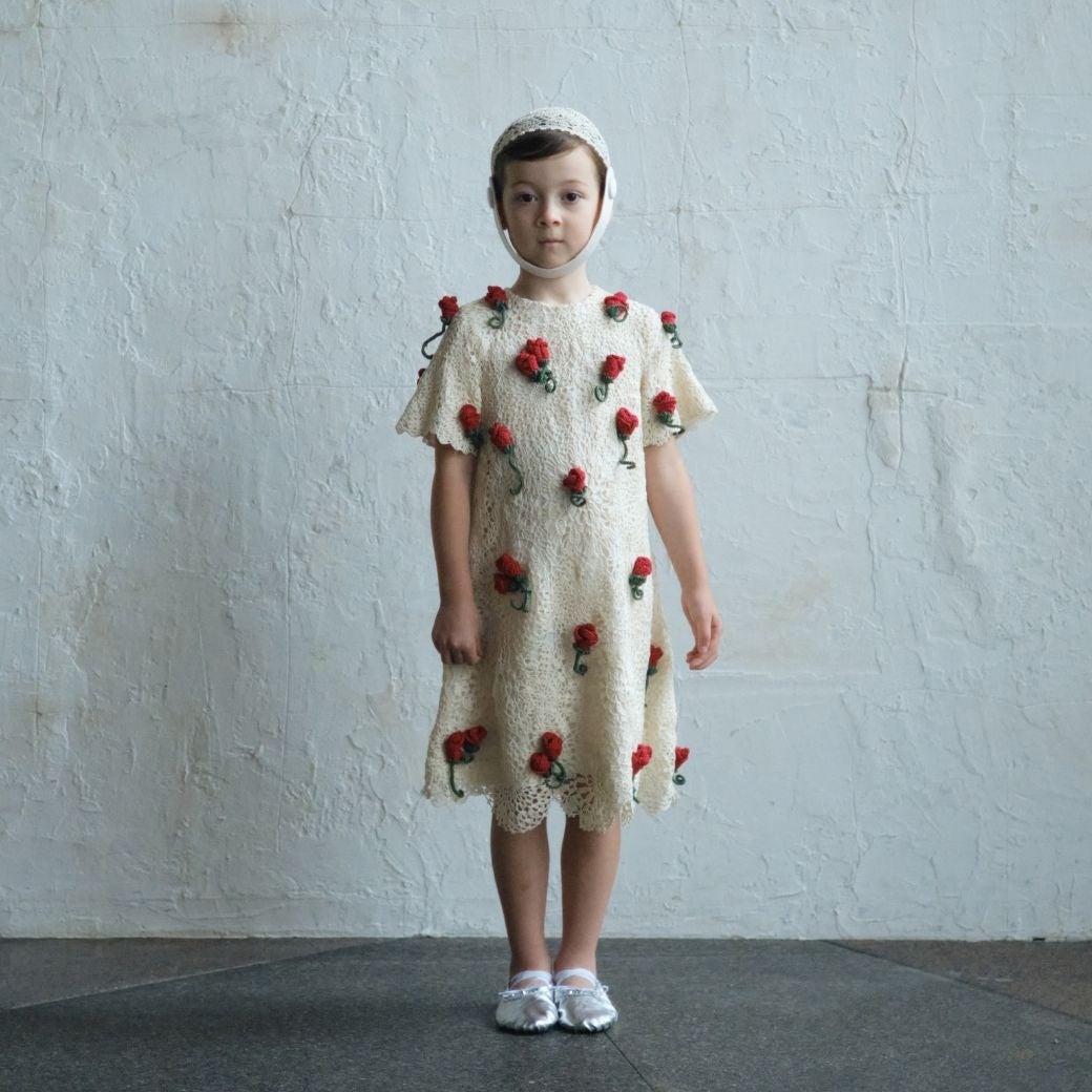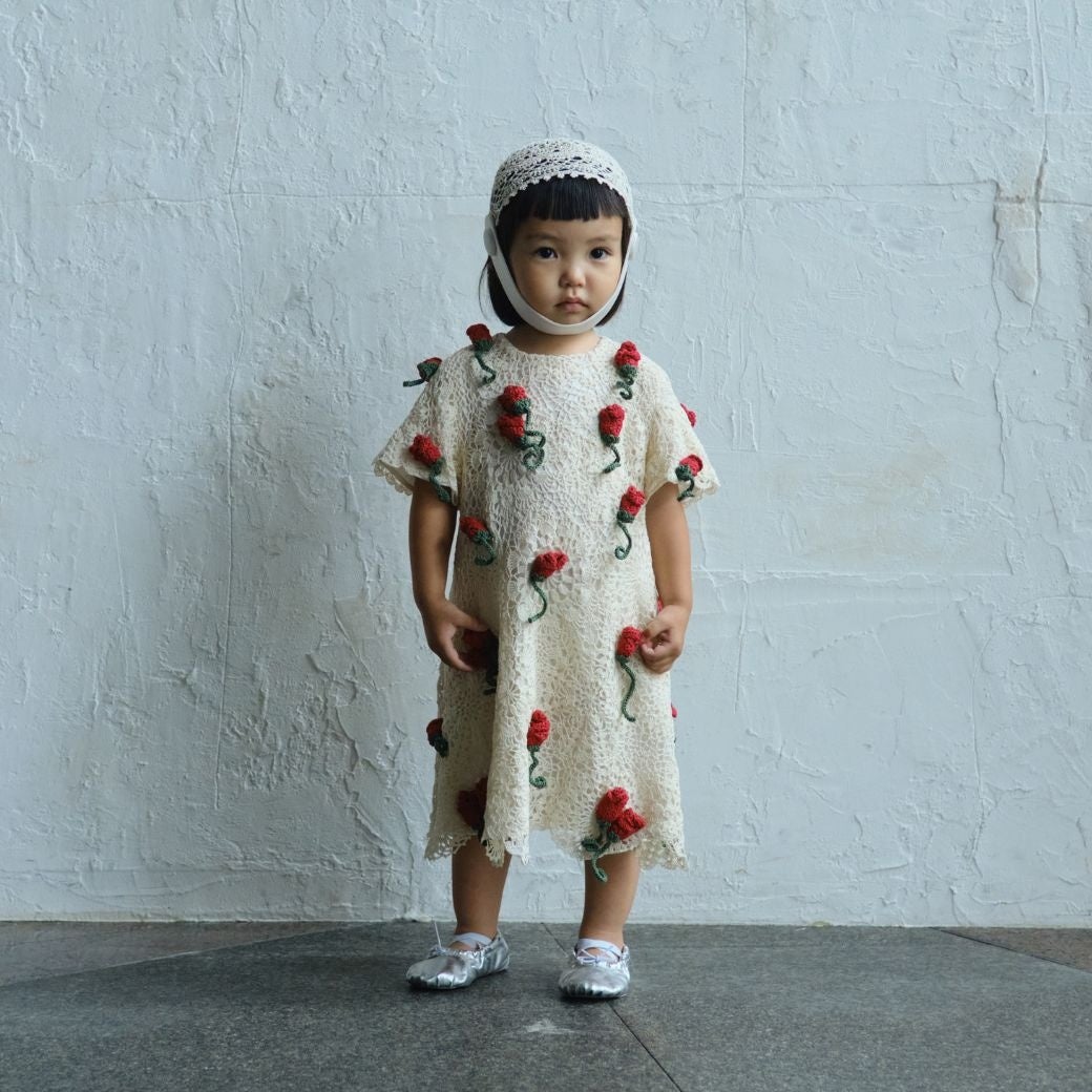 花のモチーフをちりばめた可憐なニットレースのドレス。 精巧な職人技を駆使し、贅沢に時間を費やして作り上げました。日本が誇る手仕事の素晴らしさを体現しています。 立体的なフォルムで着やすさもあわせ持つ、至高のラグジュアリードレス。