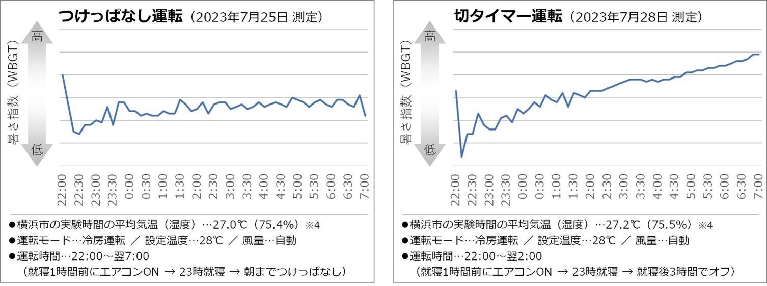 睡眠時にエアコンをつけっぱなしにすることへの抵抗感から切タイマーを使う人は多いかもしれません。そこでダイキンは、神奈川県横浜市にある一般の住宅において、朝までエアコンをつけっぱなしにする「つけっぱなし運転」と切タイマーを使って就寝3時間後にエアコンを切る「切タイマー運転」それぞれで室内のWBGTの変化を計測しました。「つけっぱなし運転」ではWBGTに大きな上昇は見られなかったのに対して、「切タイマー運転」の場合はエアコン停止後にWBGTが徐々に高まる結果となりました。