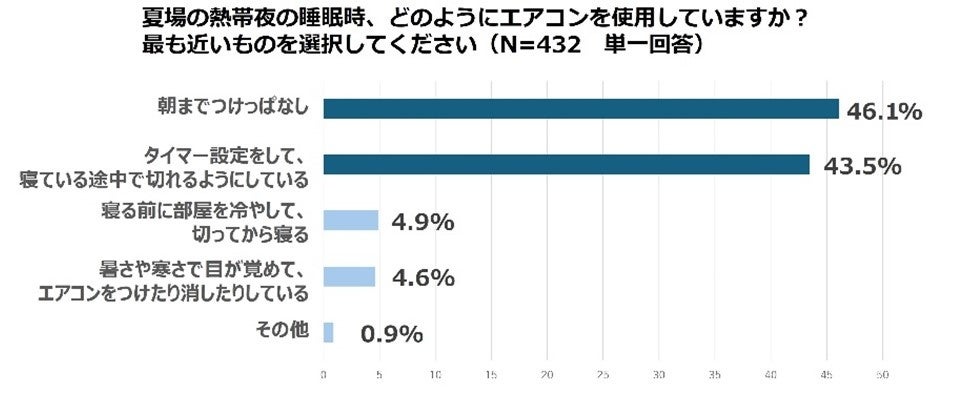 続いて、熱帯夜にエアコンを使っている人の使い方について調査しました。「朝までつけっぱなし」(46.1%)と「タイマー設定をして、寝ている途中で切れるようにしている」(43.5%)が、どちらも4割を超え、ほぼ同数という結果となりました。今回の調査では、「つけっぱなし運転派」と「切タイマー運転派」には節電意識や睡眠時の困りごとに対する大きな差は無く、習慣の違いと言えそうです。