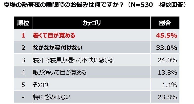 お悩みの1位は「暑くて目が覚める」、2位は「なかなか寝付けない」