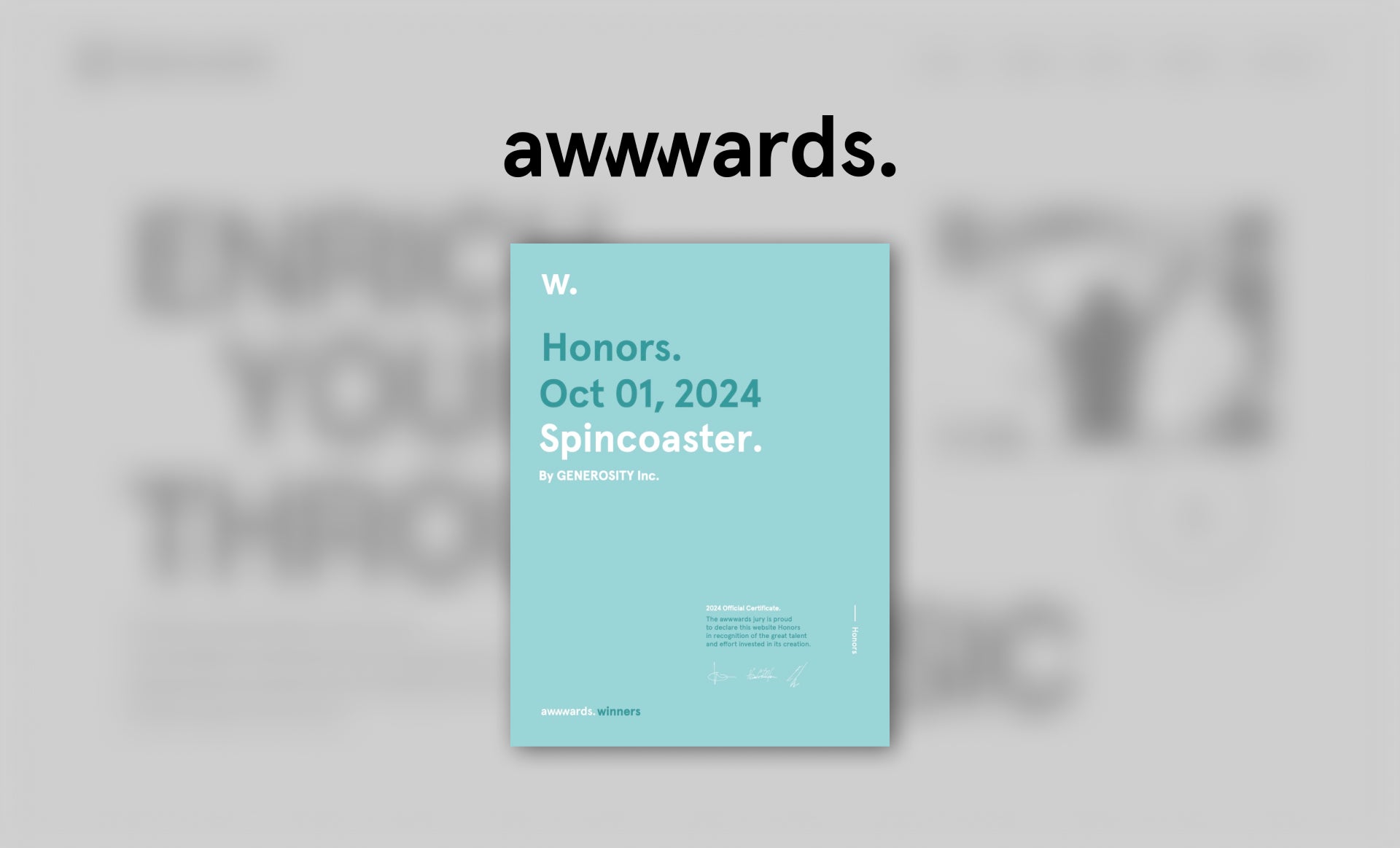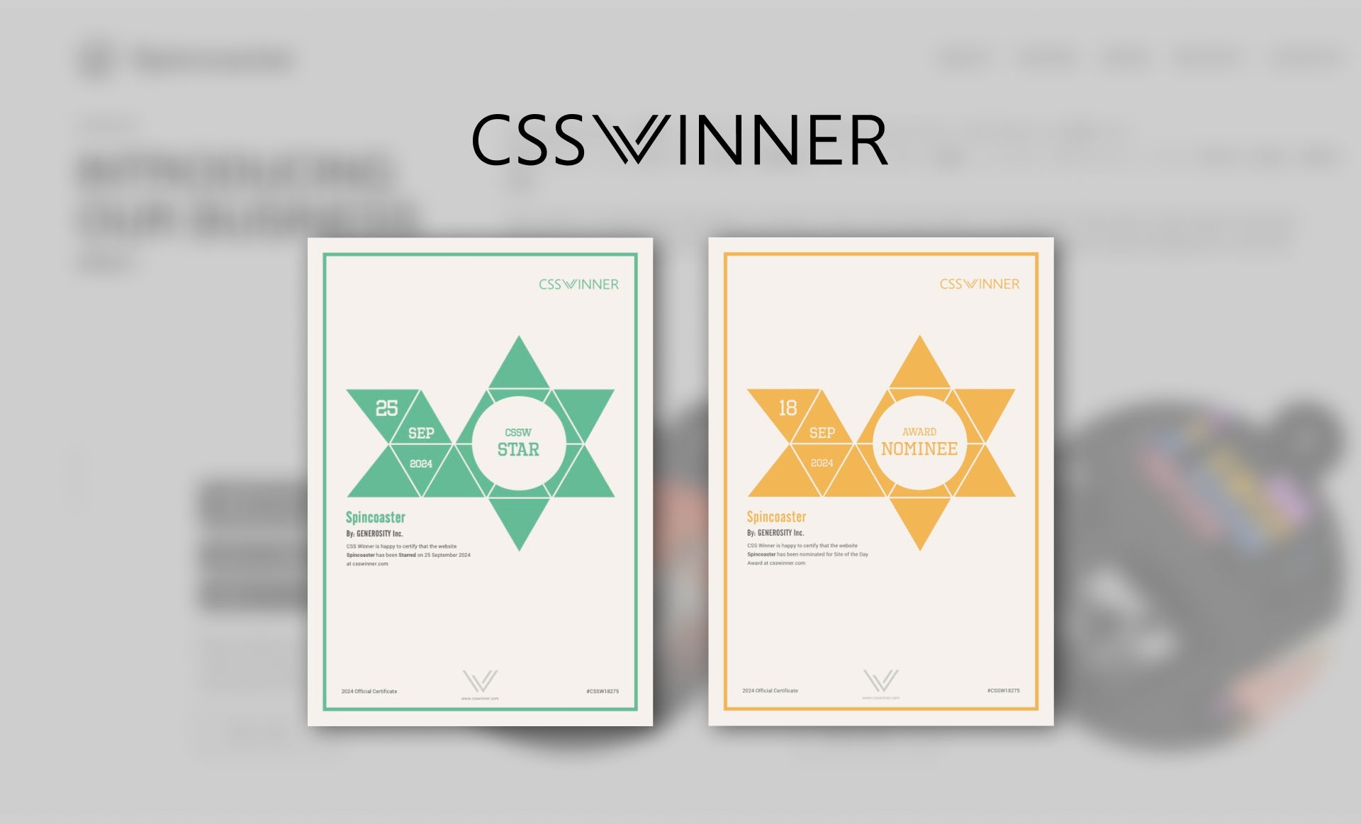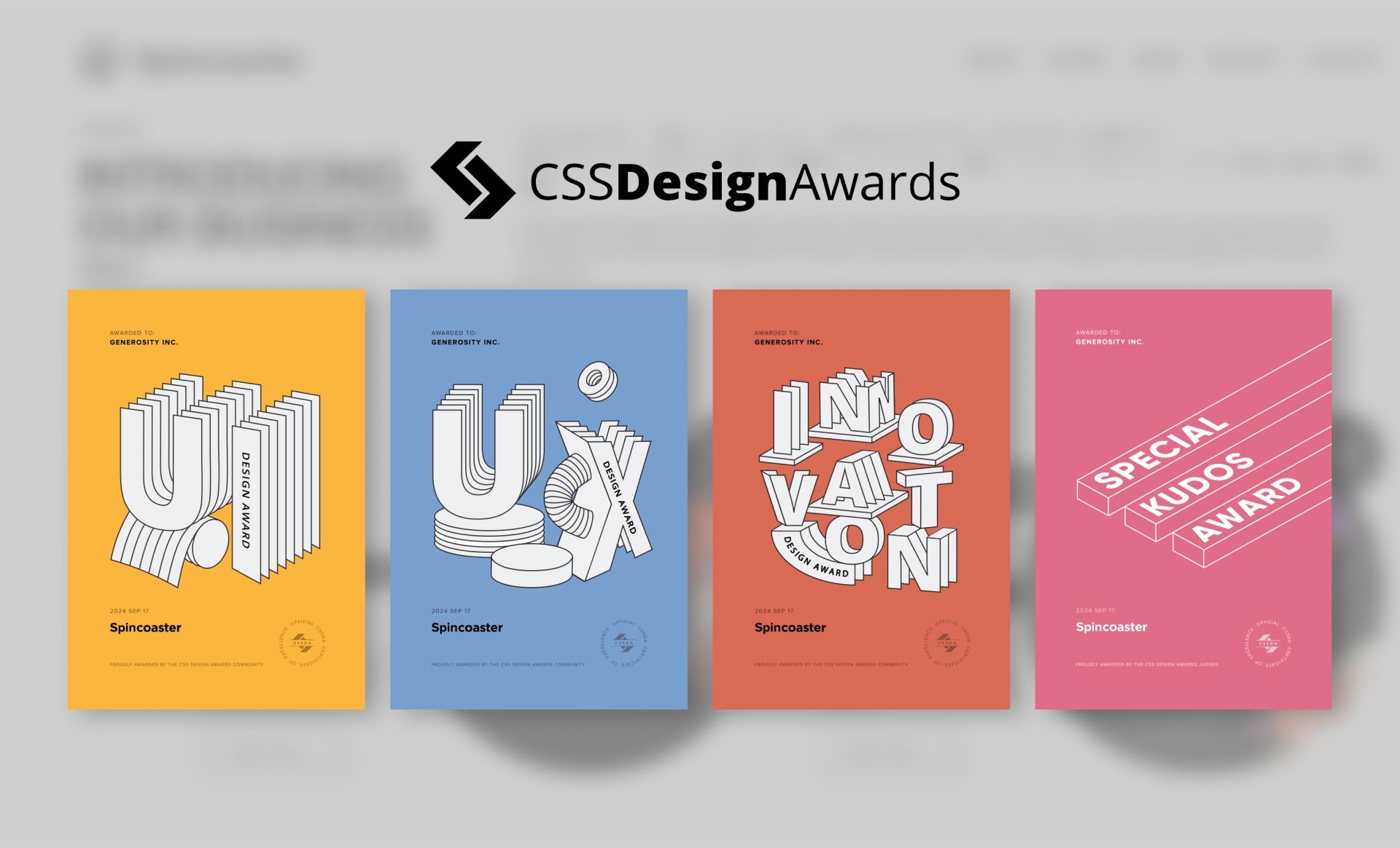 株式会社GENEROSITY(本社:東京都港区、代表取締役CEO:西垣 雄太)は、この度、株式会社SpincoasterのWEBサイト制作支援において、世界的なWEBデザイン・開発アワード『CSS Design Award』にて審査員と一般投票から高い評価を受けたことにより、「Best UI Design」「Best UX Design」「Best Innovation」のトリプル受賞および特別賞「Special Kudos」を受賞いたしました。また、『Awwwards』では「Site Of The Day」にノミネートされ「honorable mention」を受賞し、『CSS Winner Award』では「Site Of The Day」にノミネートされ「STAR」部門を受賞しています。