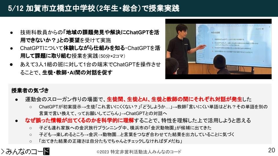 5月12日に加賀市立橋立中学校でChatGPTを使った授業を行いましたので、その実践とアンケート結果についてお話しました。