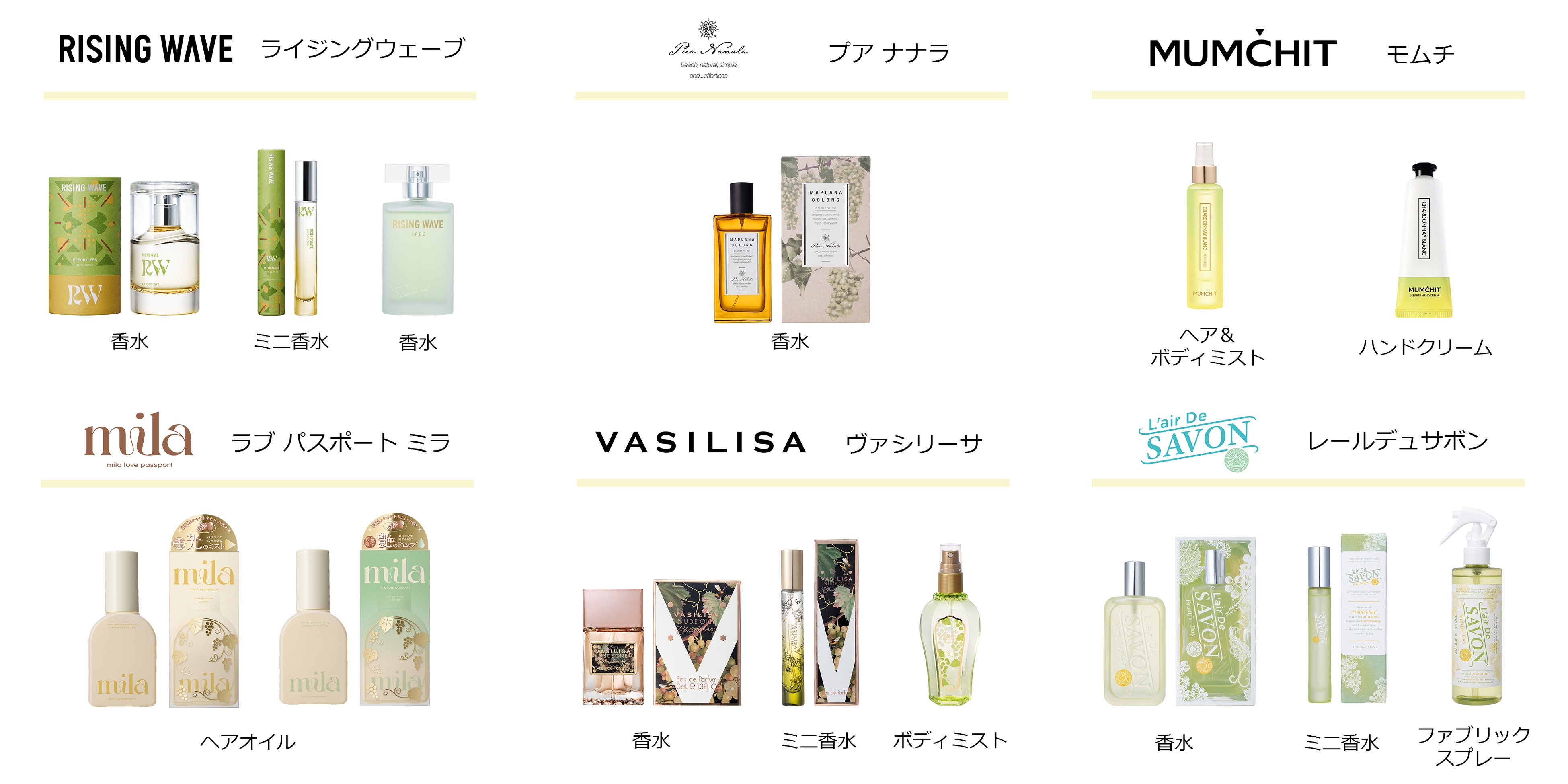今年は、6ブランドから「シャルドネの香り」に関する製品が登場。香水に加え、ボディミスト、ハンドクリーム、ヘアオイル、ファブリックスプレーなど、幅広いラインナップでシャルドネの香りをお楽しみいただけます。