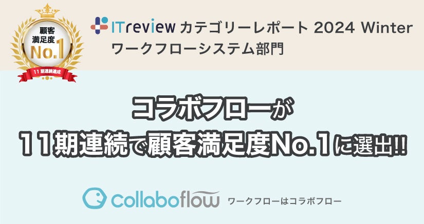 2023年12月までに掲載されたレビューを元に「ITreview カテゴリーレポート 2024 Winter」が発表され、コラボフローがワークフローシステム部門の11期連続「顧客満足度No.1」に選ばれました。
