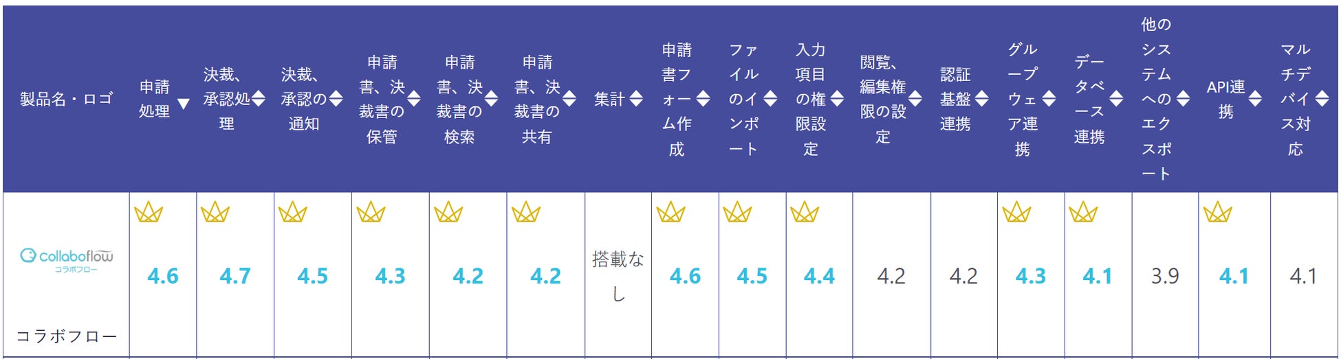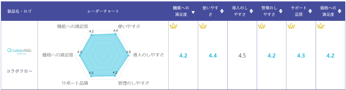 コラボフローは、ワークフローシステム部門の全28の評価項目のうち、満足度No.1をはじめとする過去最多の21項目でNo.1評価を獲得しました。No.1を獲得した各項目は以下の通りです。