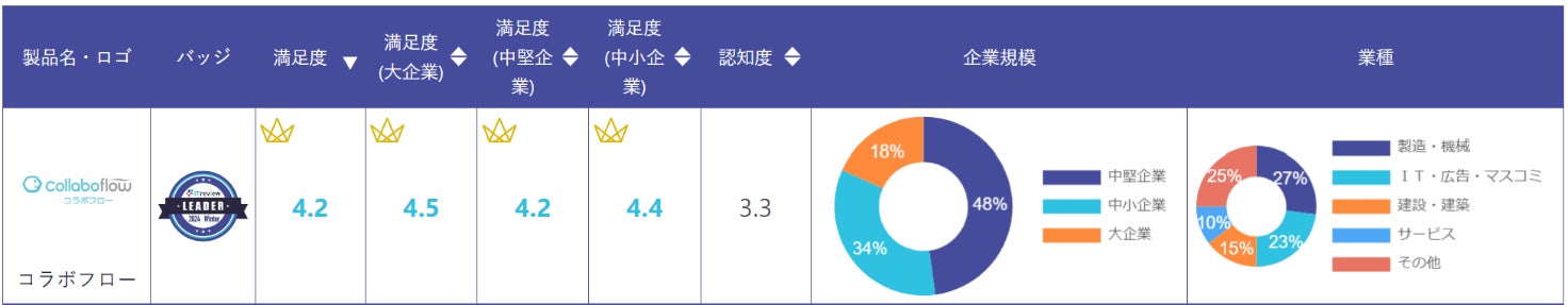 コラボフローが「ITreviewカテゴリーレポート 2024 Winter ワークフローシステム部門」で11期連続で顧客満足度No.1に選出