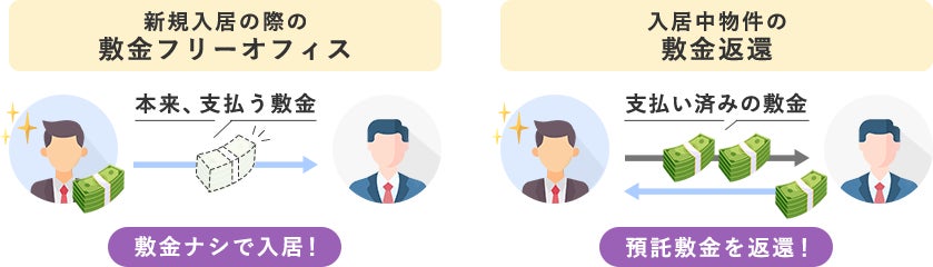 オフィスを探している企業が企業規模やエリア情報等の希望条件を入力すると、適正な月額賃料とマッチした物件がレコメンド表示される機能「適正賃料シミュレーション」での物件提案や、オフィス移転に関するコラムなど、オフィス入居にあたって便利な情報を提供します。企業はスピーディーに、希望条件に沿った敷金フリー/半額オフィスを見つけることが可能となります。