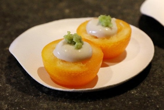 わさびの香りを最大限に際立たせる方法の集大成として、梅原氏にわさびを活用したコース料理を考えていただきました。わさびは、イメージが強い“ツンとした香り”だけでなく、リラックス効果のあるリナロールなど、多くの香気成分を持っています。また、本わさびとチューブわさびを比較しても含まれる香気成分は異なります。